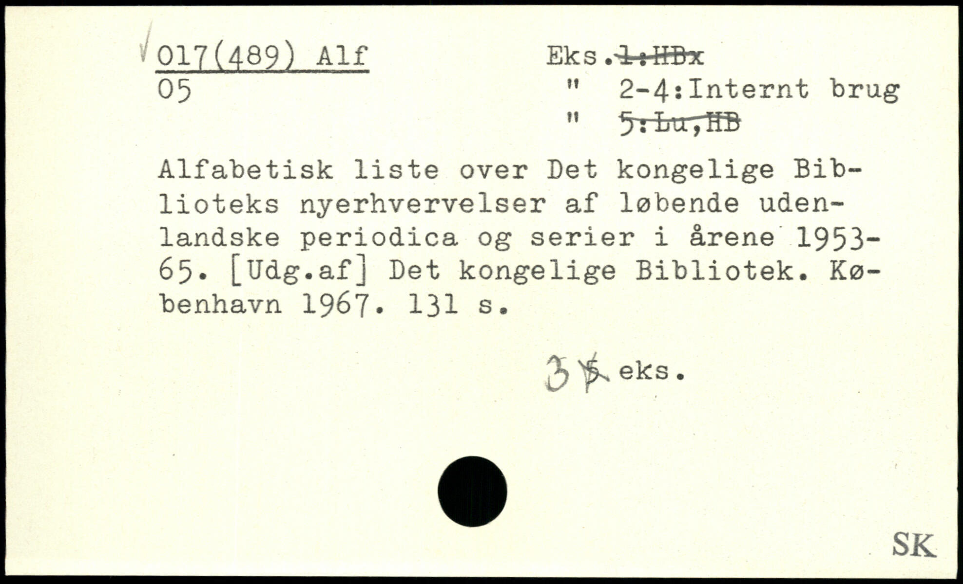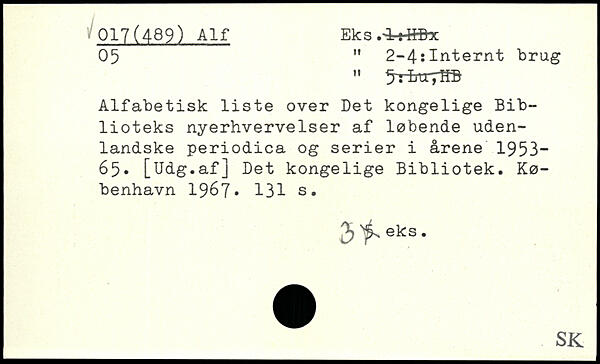 05 ” 2-4:Internt brug " ^rrhvrjm Alfabetisk liste over Det kongelige Biblioteks nyerhvervelser af løbende udenlandske periodica og serier i årene 1953-65. [Udg.af] Det kongelige Bibliotek.