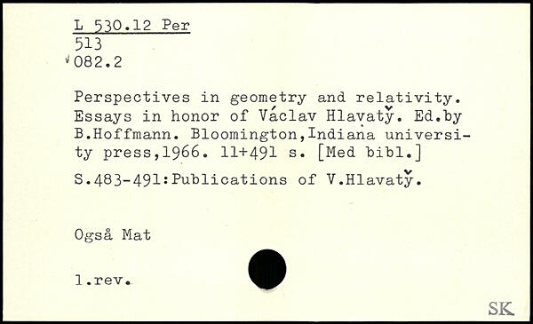 Perspectives in geometry and relativity. Essays in honor of Vaclav Hlavaty. Ed.by B.Hoffmann.
