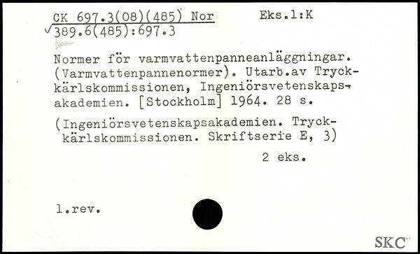 Normer för varmvattenpanneanläggningar. (Varmvattenpannenormer). Utarb.av Tryckkärl skommissionen, Ingeni örs ve t enskaps-t akademien.
