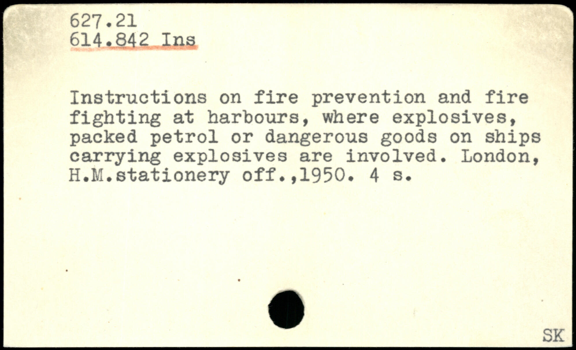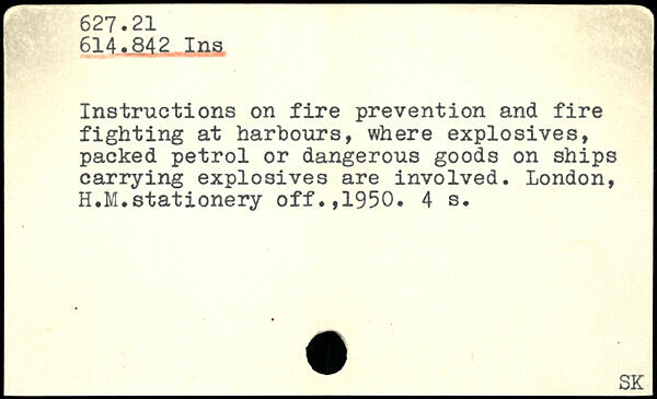 Instructions on fire prevention and fire fighting at harbours, where explosives, packed petrol or dangerous goods on ships carrying explosives are involved. London, H.M.stationery off.,1950.