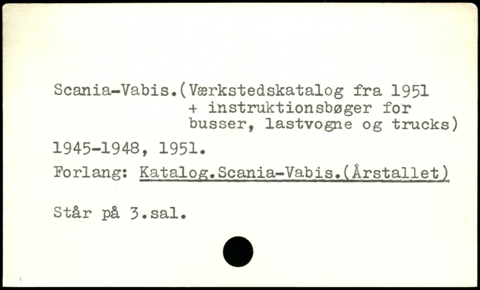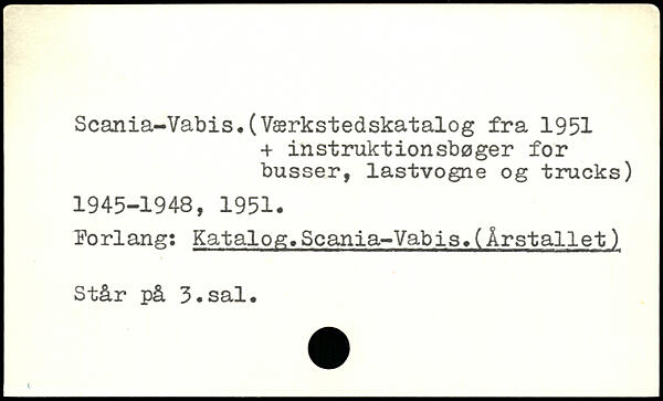 Scania-Vabis.(Værkstedskatalog fra 1951 + instruktionsbøger for busser, lastvogne og trucks) 1945-1948, 1951. Forlang: Katalog.Scania-Vabis. (Årstallet) Står på 3.sal.