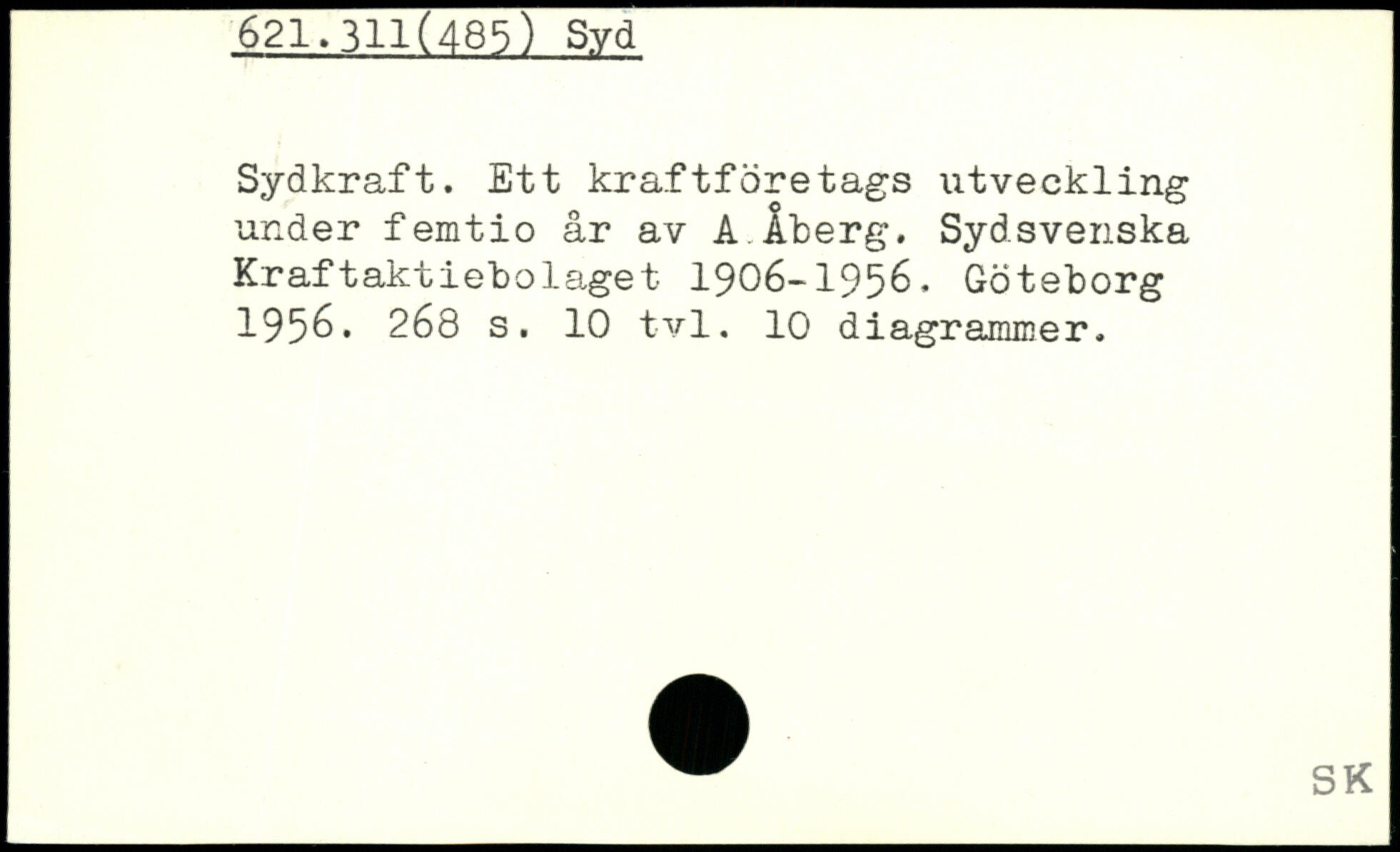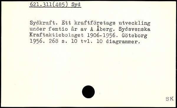 Sydkraft. Ett kraftföretags utveckling under femtio år av A iberg. Sydsvenska Kraftaktiebolaget 1906-1956. Göteborg 1956.