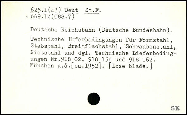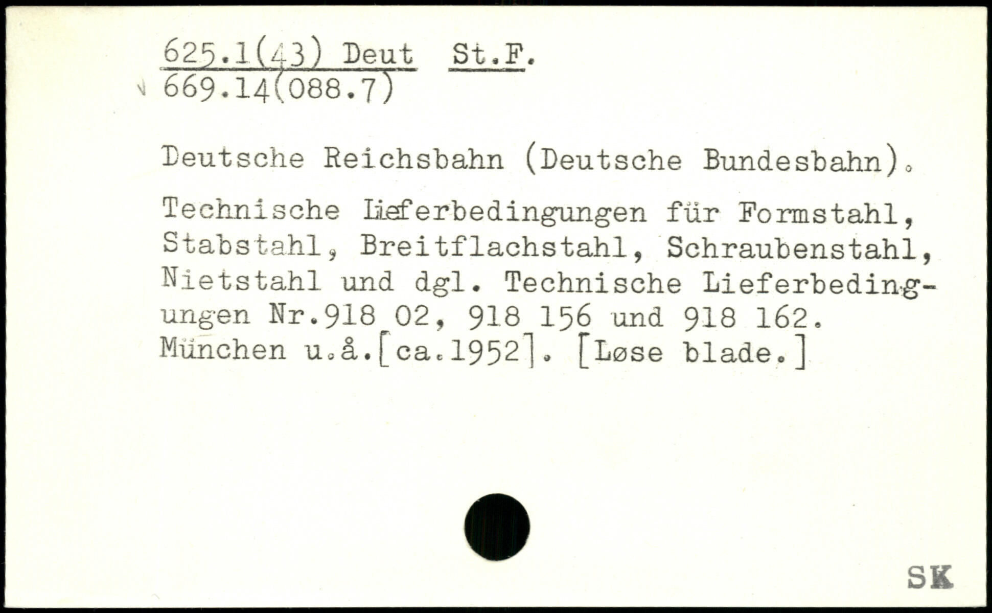 Deutsche Reichsbahn (Deutsche Bundesbahn), Technische Lieferbedingungen für Formstahl, Stabstahl, Breitflachstahl, Schraubenstahl, Nietstahl und dgl. Technische Lieferbedingungen Nr.918 02, 918 156 und 918 162. München u.d.[ca.1952]. [Lose blade.]