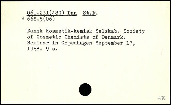 Dansk Kosmetik-kemisk Selskab. Society of Cosmetic Chemists of Denmark. Seminar in Copenhagen September 17? 1958