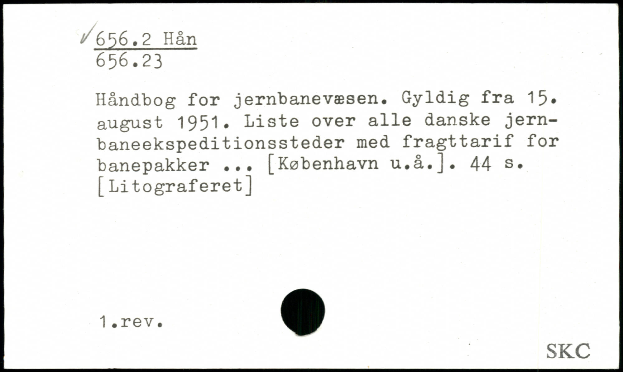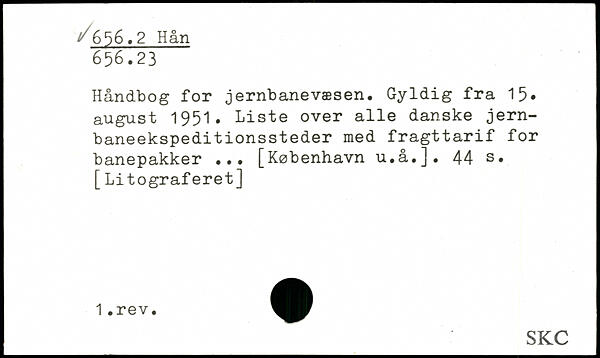 Håndbog for jernbanevæsen. Gyldig fra 15, august 1951. Liste over alle danske jernbaneekspedit ionssteder med fragttarif for banepakker ...