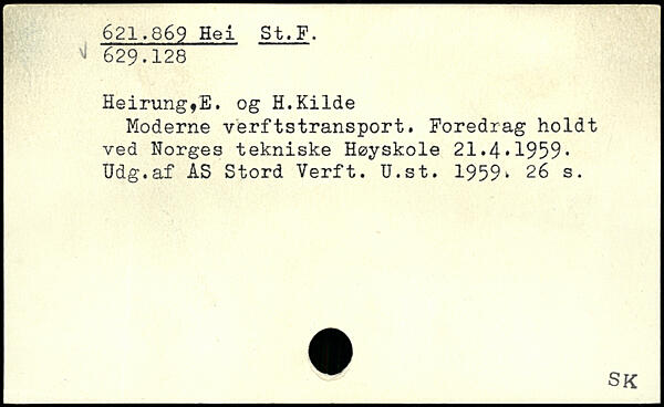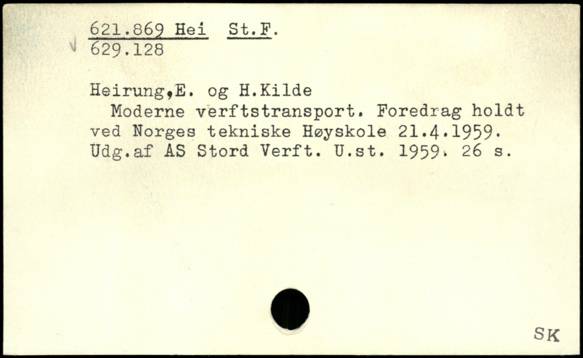 Moderne verftstransport. Foredrag holdt ved Norges tekniske Høyskole 21.4.1959. Udg.af AS Stord Verft. U.st. 1959.
