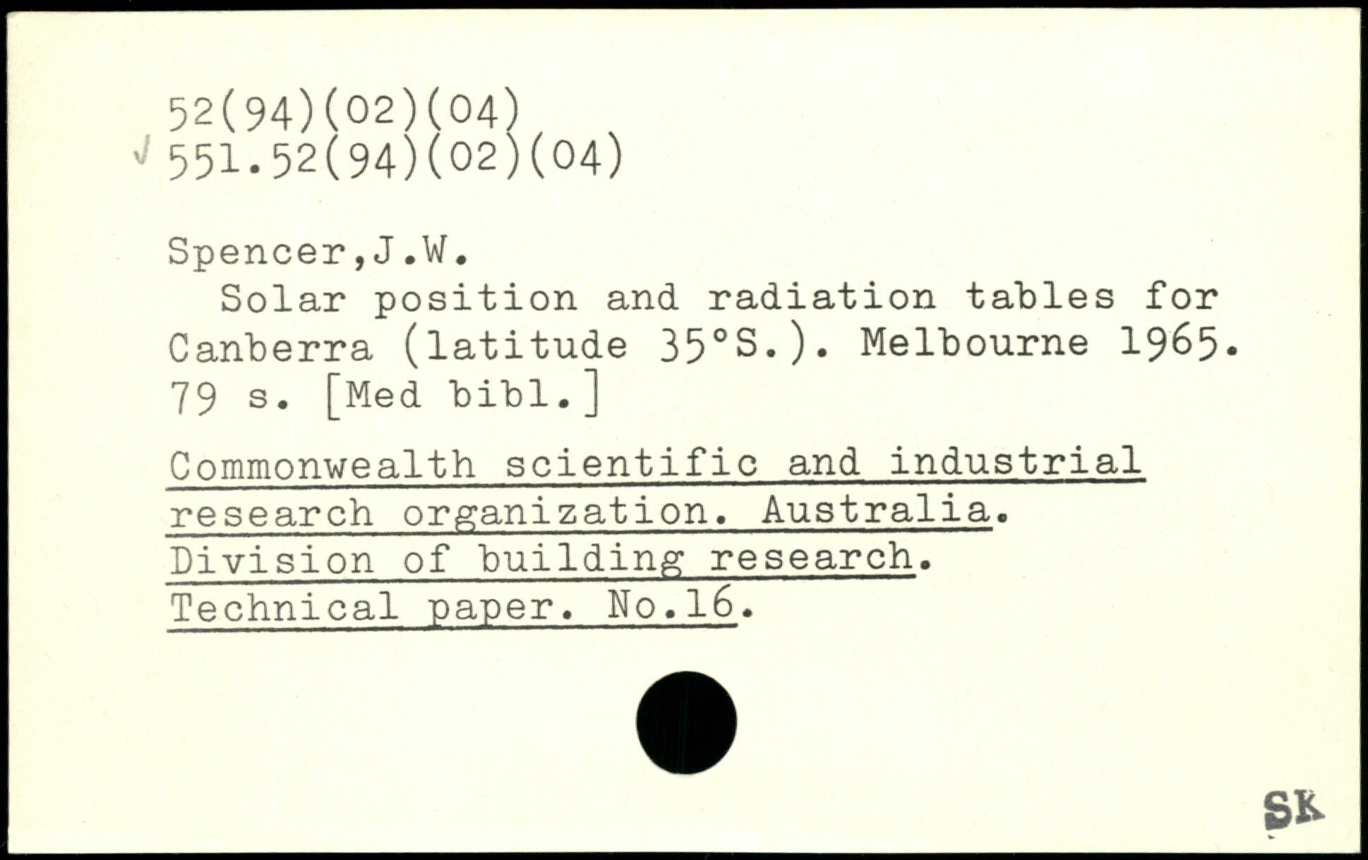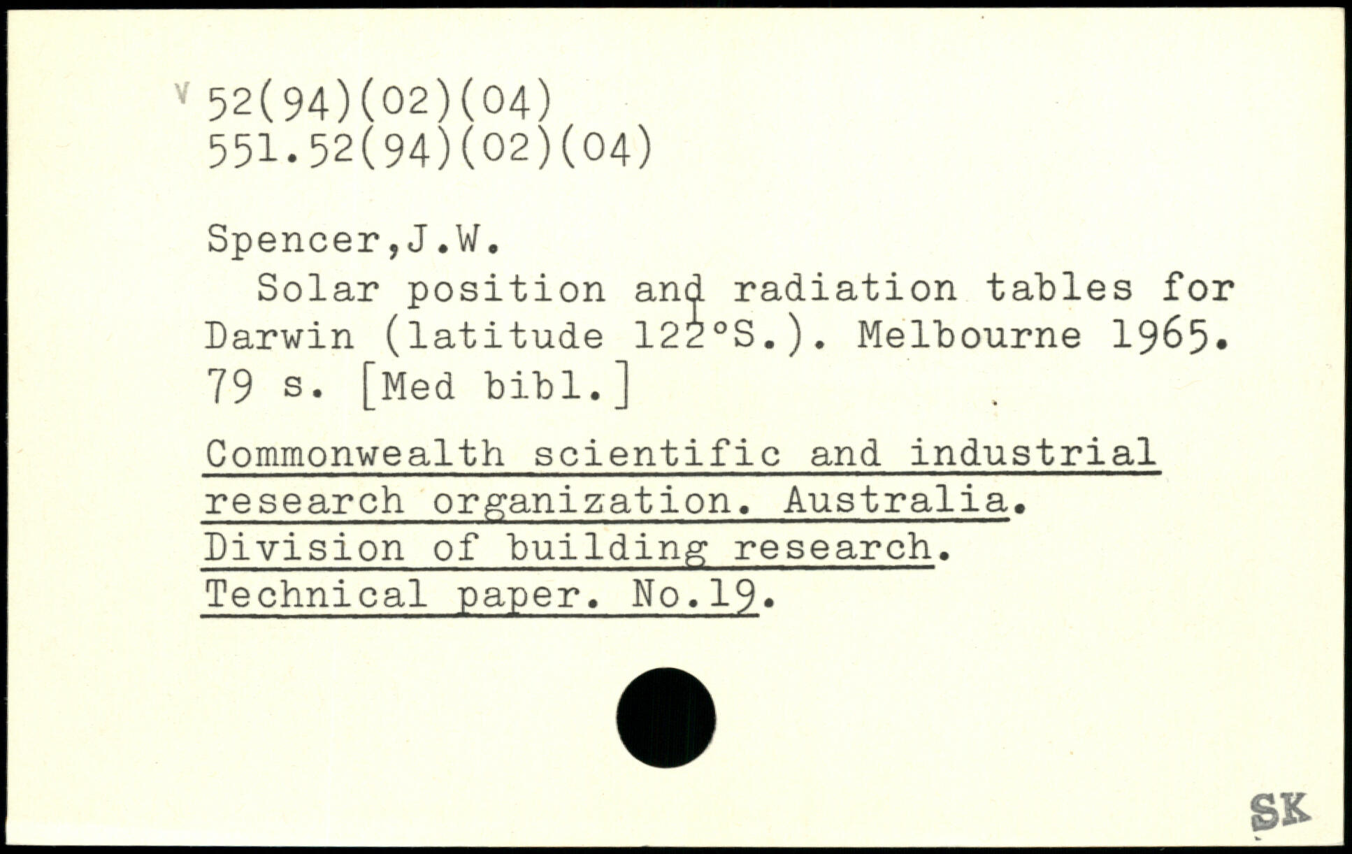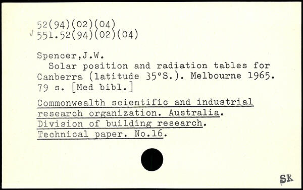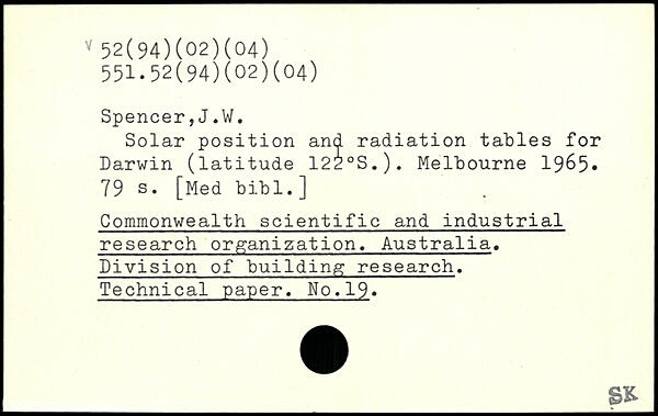 Solar position and radiation tables for Darwin (latitude 122.S.). Melbourne 1965