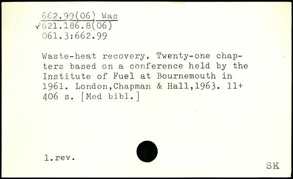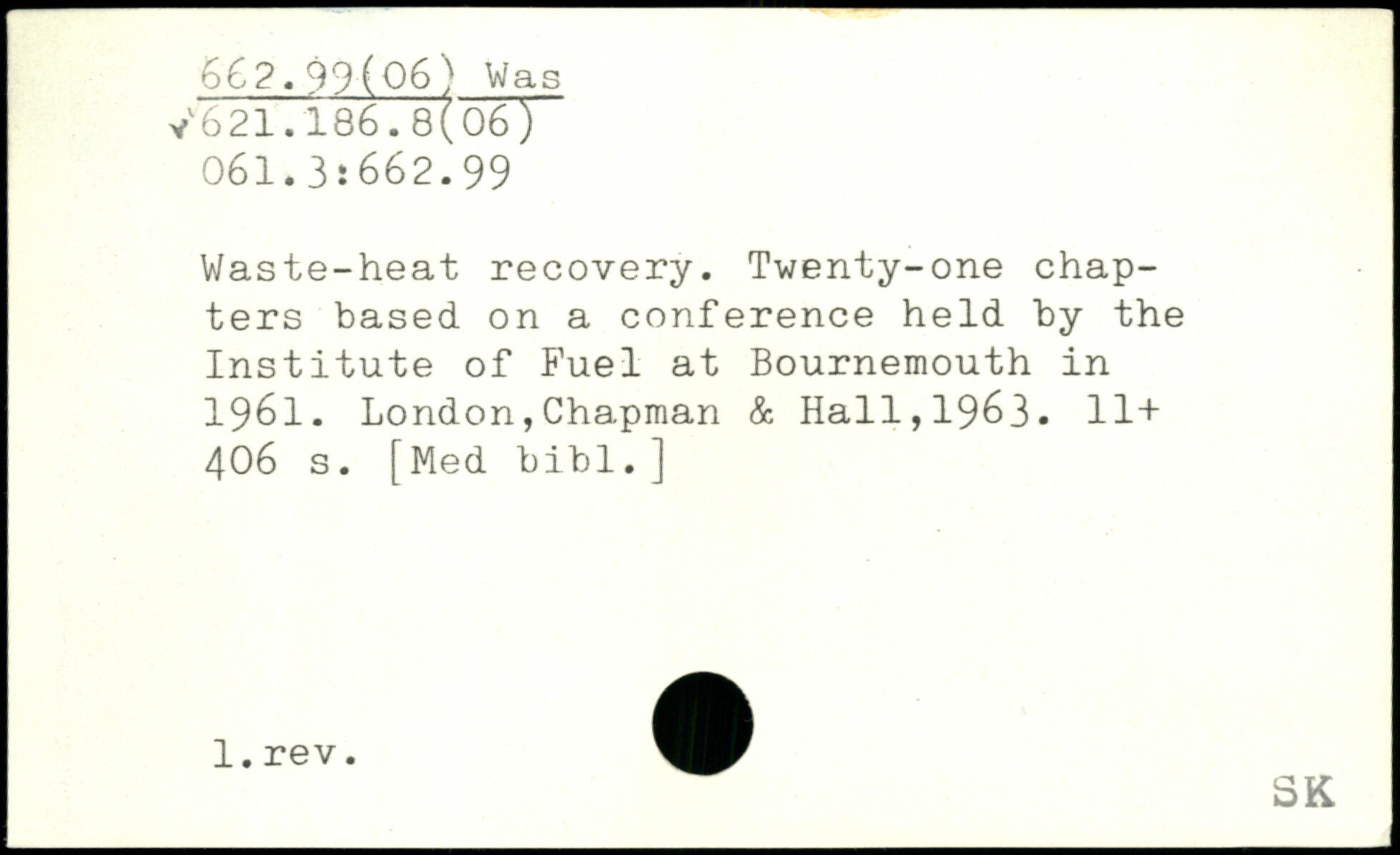 Waste-heat recovery. Twenty-one chapters based on a conference held by the Institute of Fuel at Bournemouth in 1961.