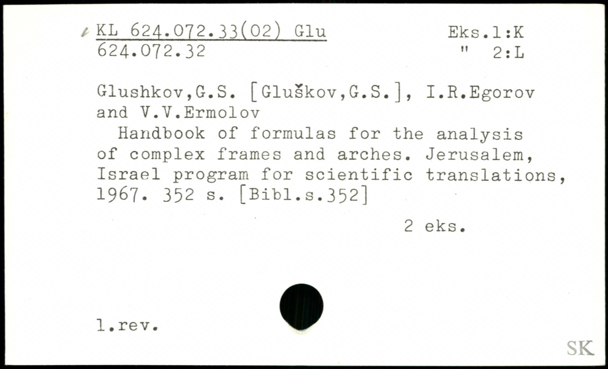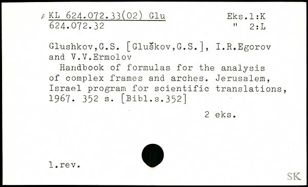 Glushkov,G.S. [Gluskov,G.S.], I.R.Egorov and V.V.Ermolov Handbook of formulas for the analysis of complex frames and arches. Jerusalem, Israel program for scientific translations, 1967.