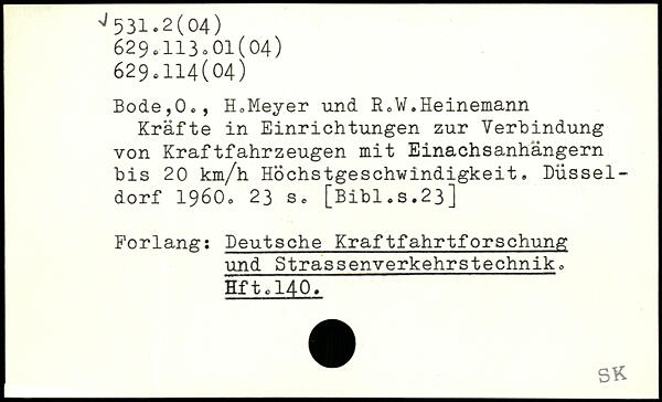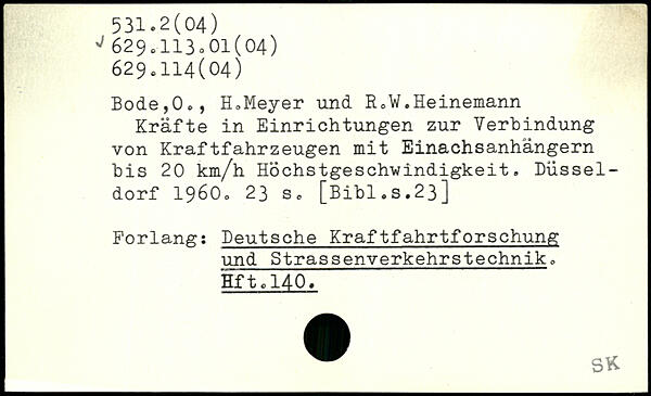 Bode,0., ËLMeyer und R,W.Heinemann Kräfte in Einrichtungen zur Verbindung von Kraftfahrzeugen mit Einachsanhängern bis 20 km/h Höchstgeschwindigkeit. Düsseldorf 1960o
