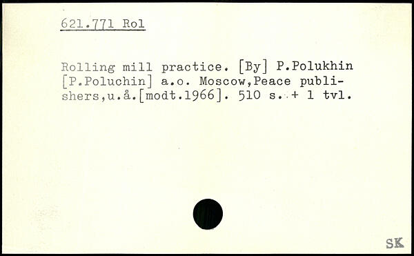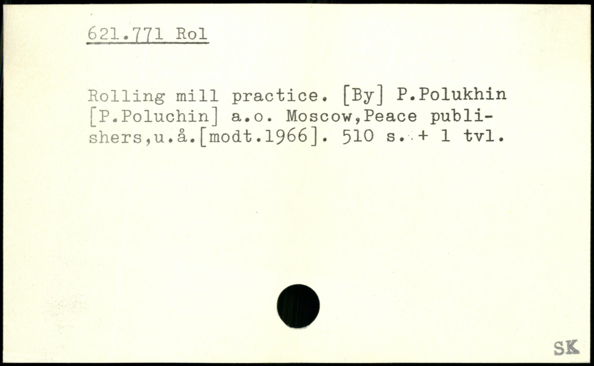 Rolling mill practice. [By] P.Polukhin [P.Poluchin] a.o. Moscow,Peace publishers ,u. a. [modt. 1^66 ].