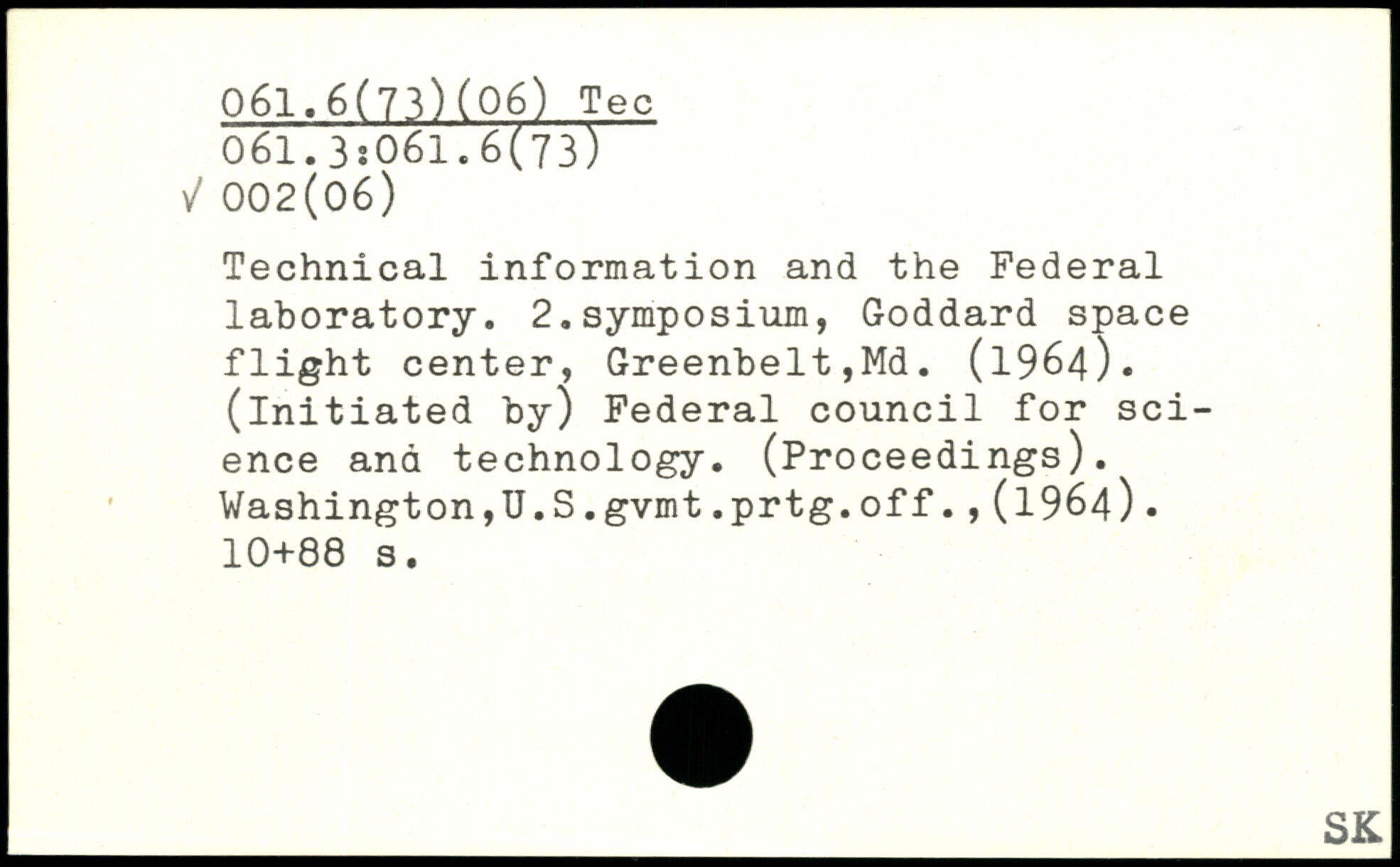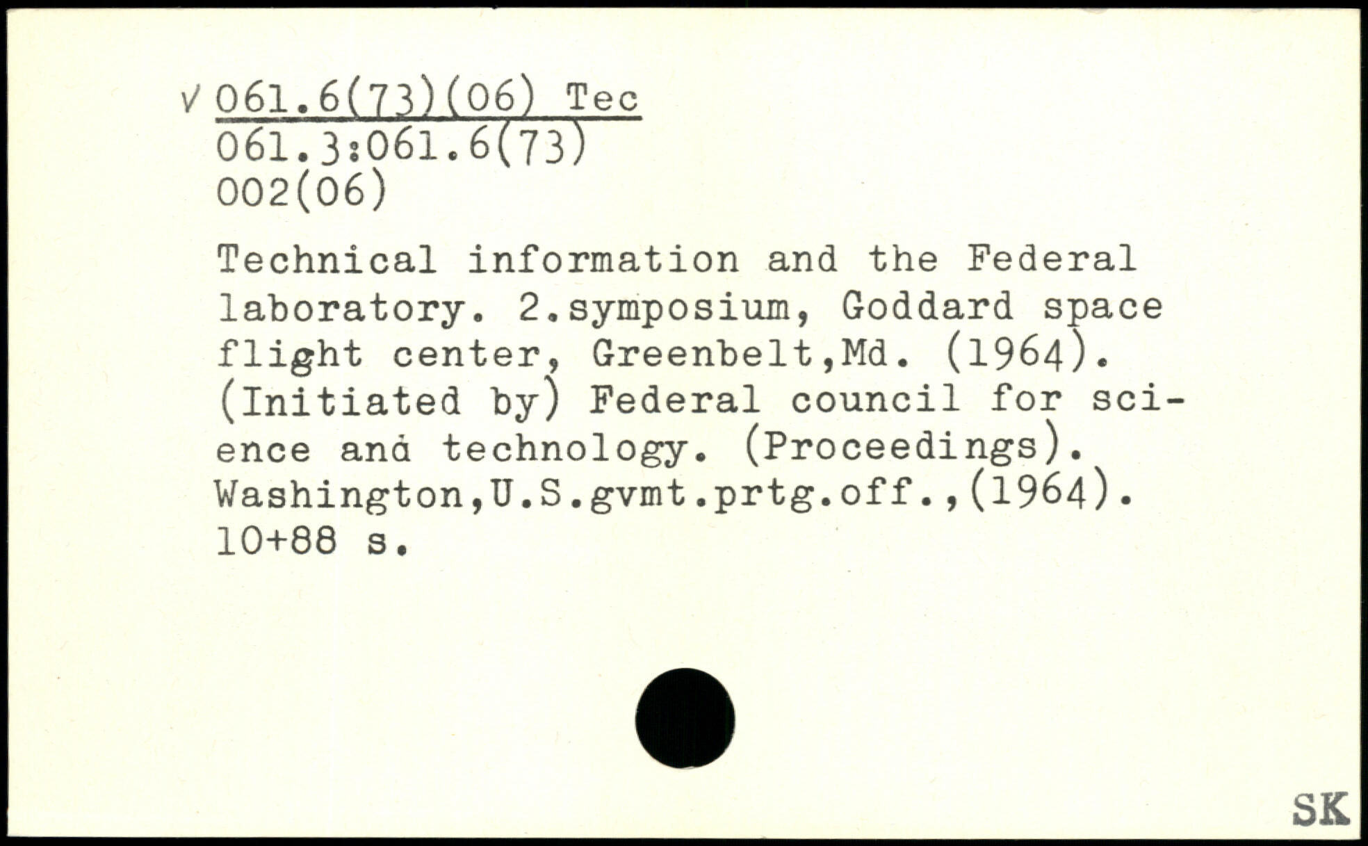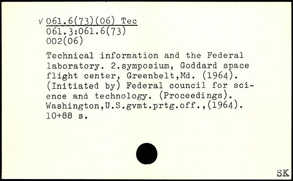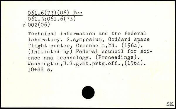 Technical information and the Federal laboratory. 2.symposium, Goddard space flight center, Greenbelt,Md. (1964). (initiated by) Federal council for science and technology. (Proceedings). Washington,U.S.gvmt.prtg.off.,(1964).