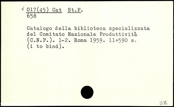 Catalogo della biblioteca speeializzata del Comitato Nazionale Produttività (C.N.P.). 1-2. Boma 1959. II+59O s, (i to bind).