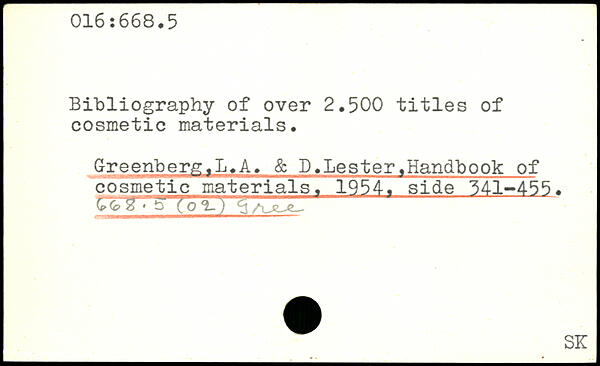 Bibliography of over 2.500 titles of cosmetic materials. Greenberg,L.A. & D.Lester^Handbook of cosmetic materials, 1954, side 341-455. ongTgr7^L 7T7:r.^ -