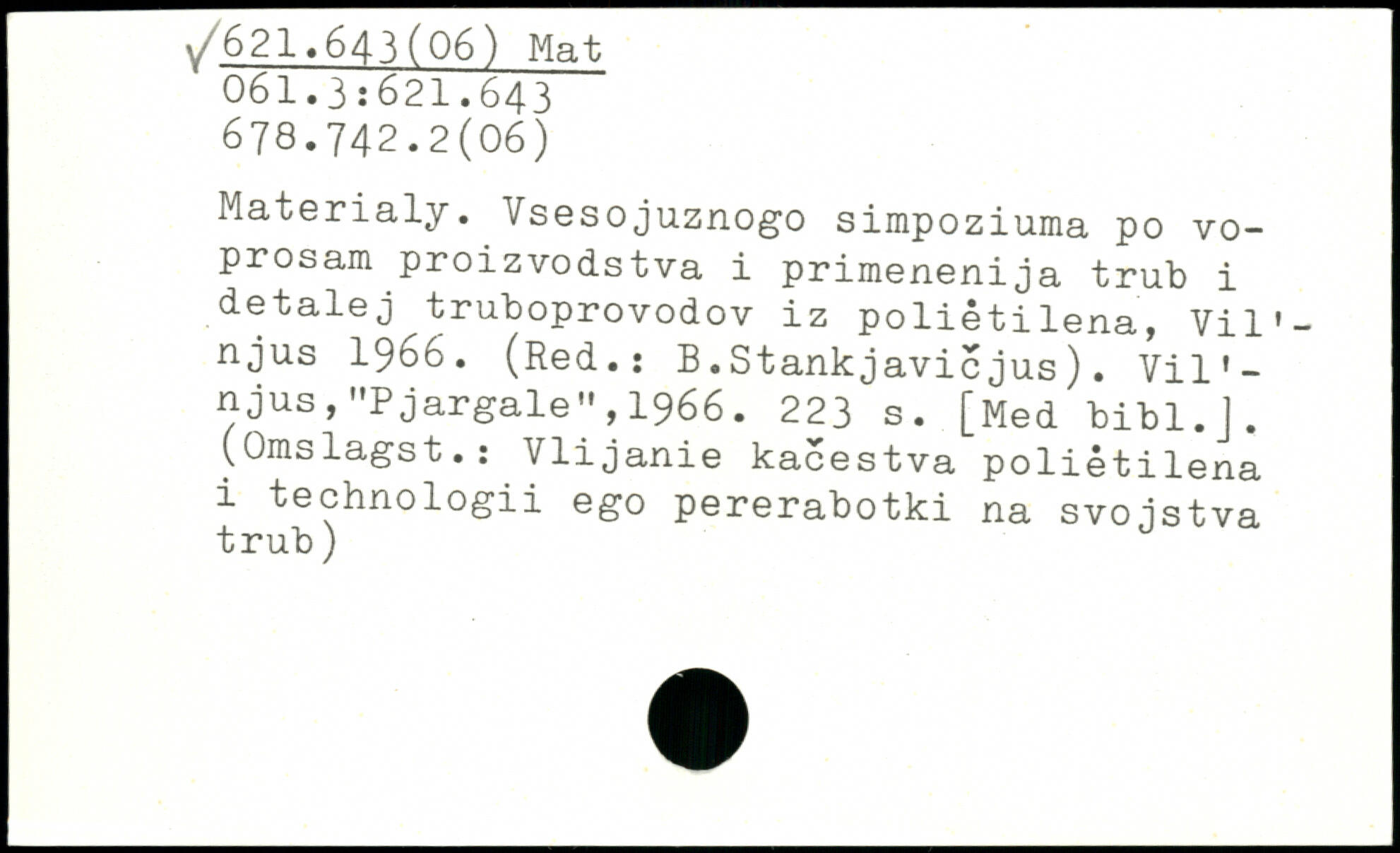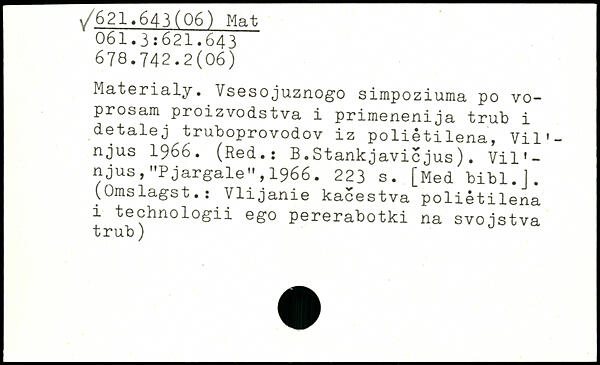 Materialy. Vsesojuznogo sirapoziuma po vo-prosam proizvodstva i primenenija trub i detalej truboprovodov iz poliétilena, Vil'-njus 1966. (Red.: B.Stankjavicjus). Vil'-njus,"Pjargale",1966.