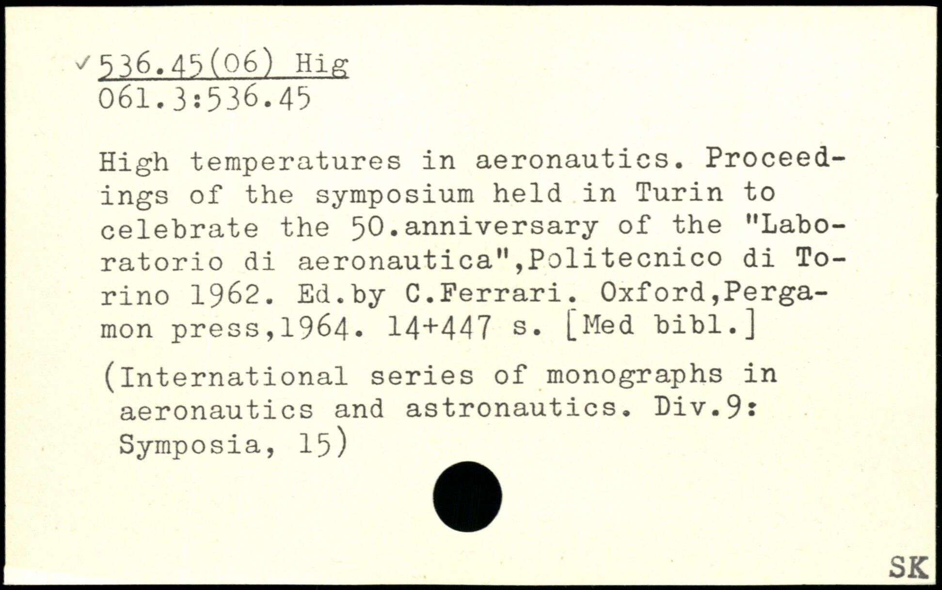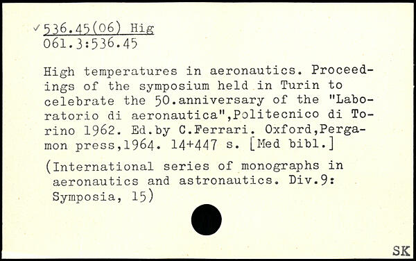 High temperatures in aeronautics. Proceedings of the symposium held in Turin to celebrate the 50.anniversary of the "Labo-ratorio di aeronautica",Politecnico di Torino 1962. Ed.by C.Ferrari.