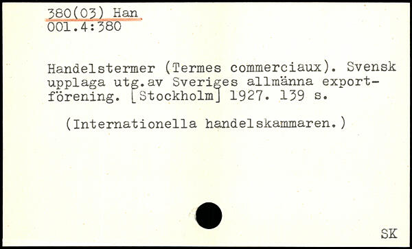 Handelstermer (Termes commerciaux). Svensk upplaga utg.av Sveriges allmänna exportförening. [StockholmJ 1927.