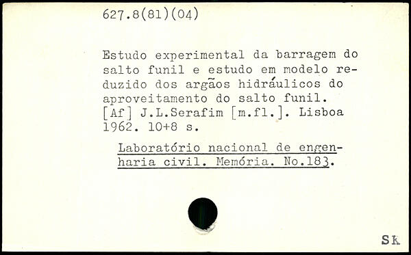 Estudo experimental da barragem do salto funil e estudo em modelo re-duzido dos argaos hidraulicos do aproveitamento do salto funil. [Af] J.L.Serafim [m.fl.]. Lisboa 1962.
