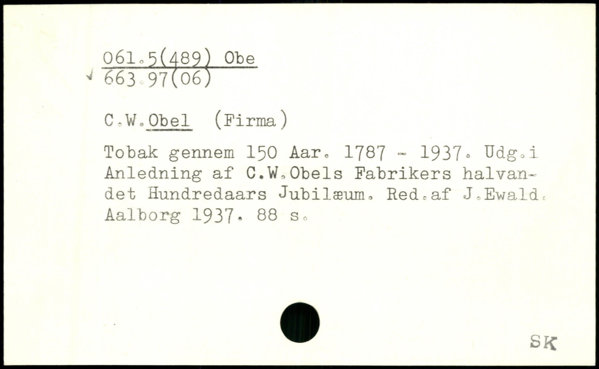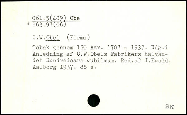 C -W.Obel (Firma) Tobak gennem 150 Aar, 1787 - 1937= Udg.i Anledning af C.V,Obels Fabrikers halvandet Hundredaars Jubilæum. Red,af J-Ewald.-