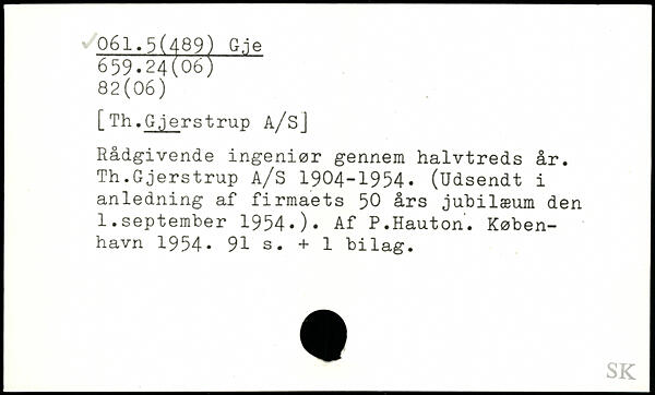 [ Th.G.jerstrup A/sj Rådgivende ingeniør gennem halvtreds år. Th.Gjerstrup A/S 1904-1954. (Udsendt i anledning af firmaets 50 års jubilæum den 1.september 1954.). Af P.Hauton.