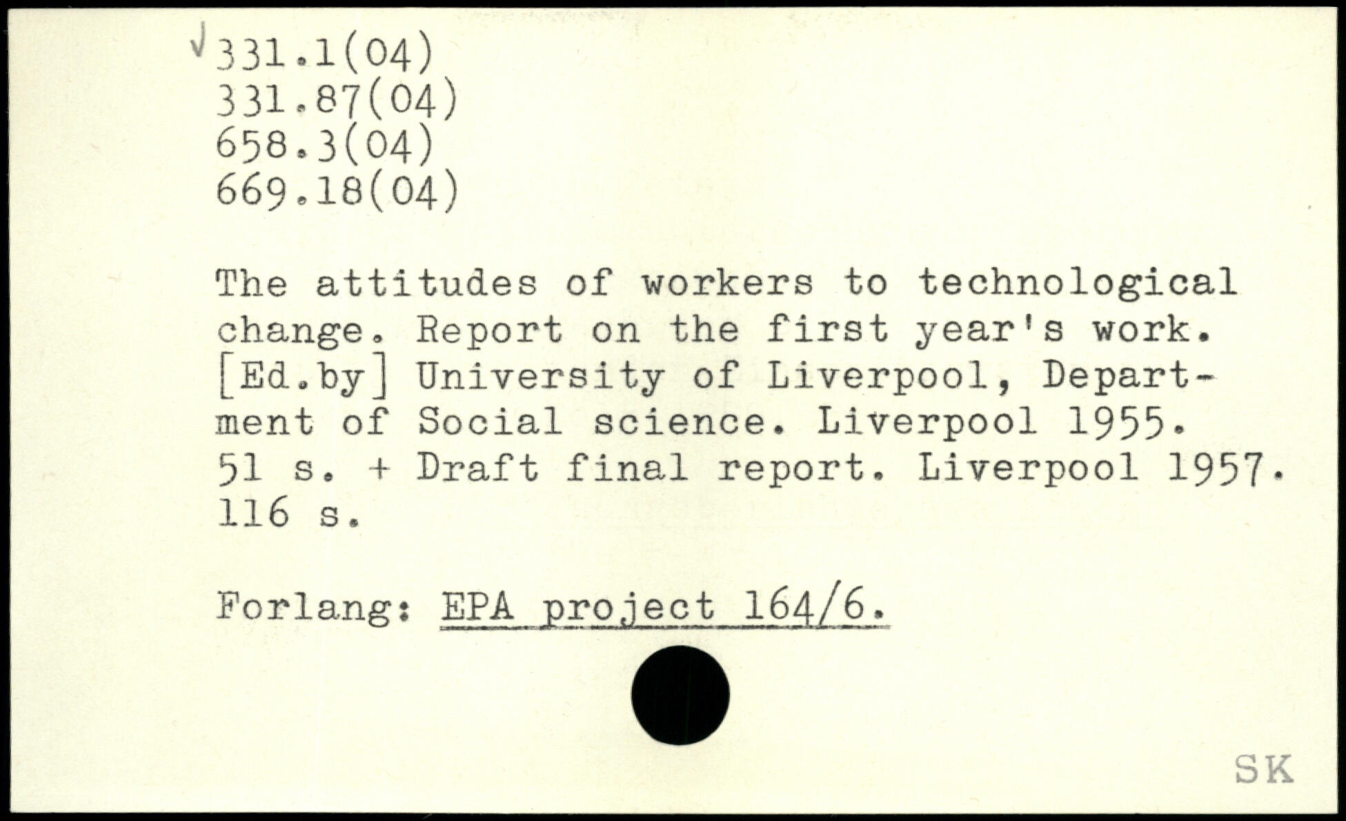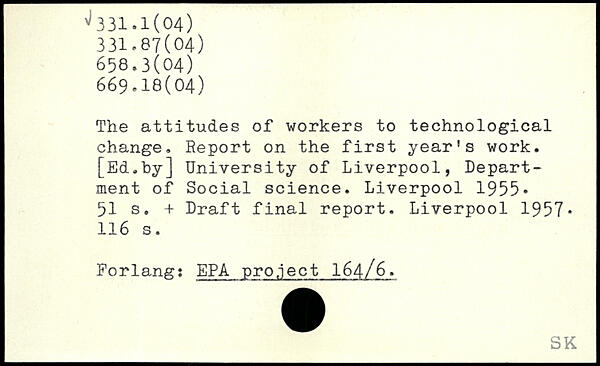The attitudes of workers to technological change. Report on the first year’s work. [Ed.by] University of Liverpool, Department of Social science.
