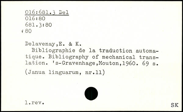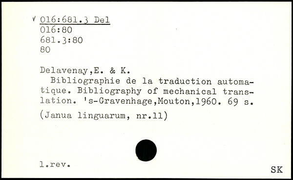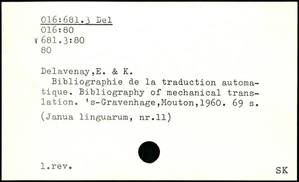 Delavenay,E. & K. Bibliographie de la traduction automatique. Bibliography of mechanical translation. 's-