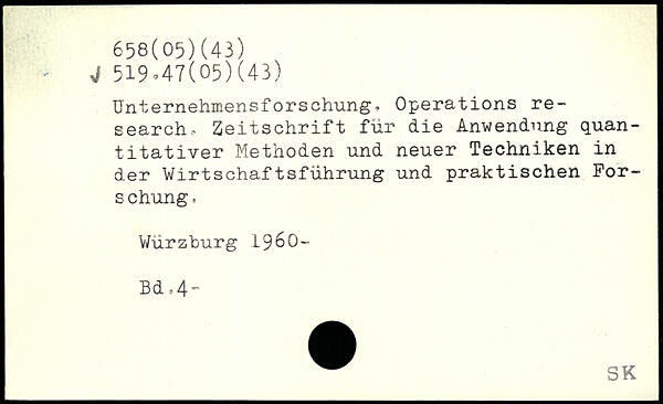 Unternehmensforschung, Operations re- | search, Zeitschrift für die Anwendung quantitativer Methoden und neuer Techniken in der Wirtschaftsführung und praktischen For-s chung. i Würzburg 1960- Bd,4“ |