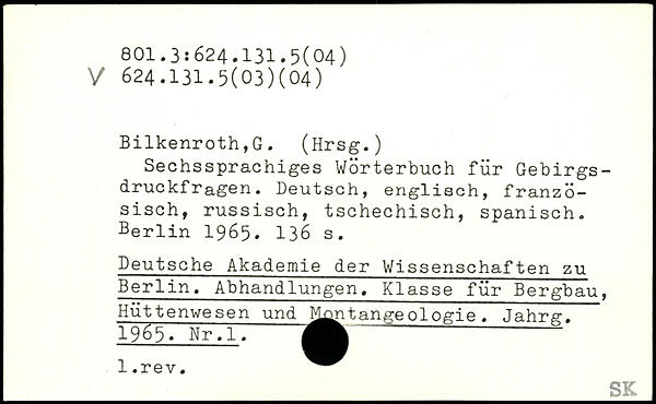 Sechssprachiges Wörterbuch für Gebirgs-druckfragen. Deutsch, englisch, französisch, russisch, tschechisch, spanisch.