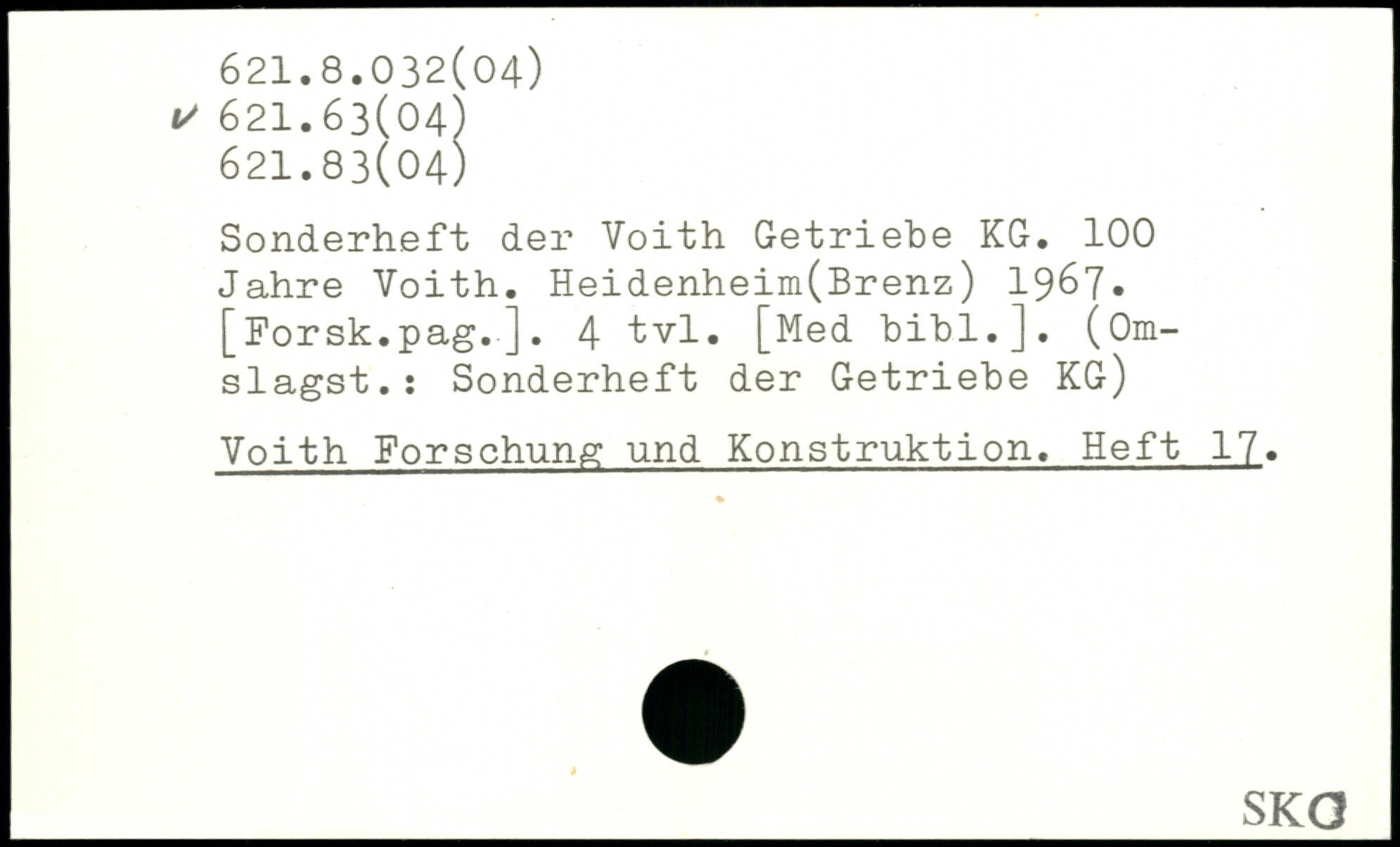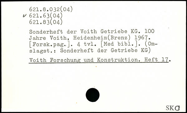 Sonderheft der Voith Getriebe KG. 100 Jahre Voith. Heidenheim(Brenz) 1967. [Forsk.pag.]. 4 tvl. [Med bibl.]. (0m-slagst.: Sonderheft der Getriebe KG) Voith Forschung und Konstruktion. Heft 17.