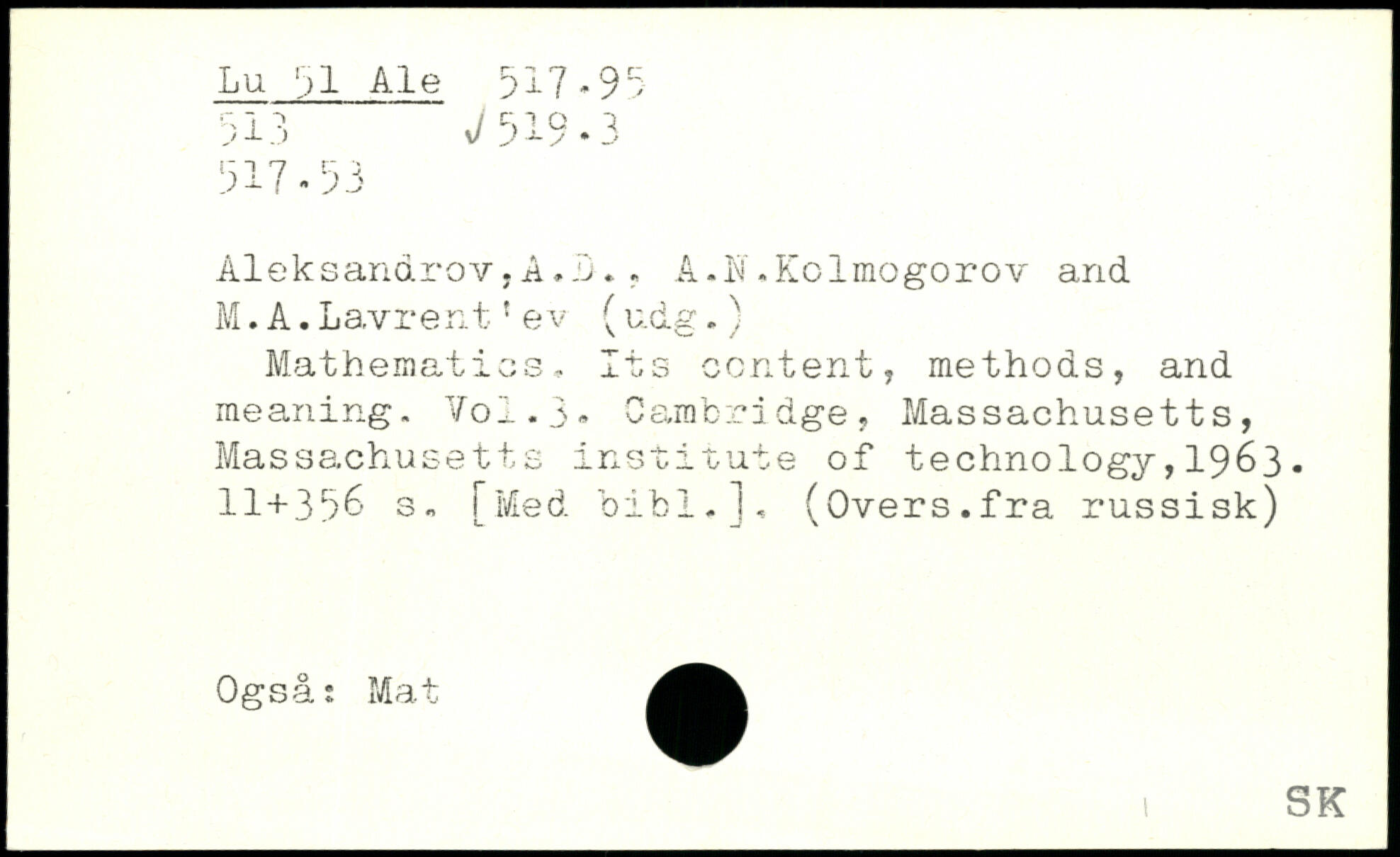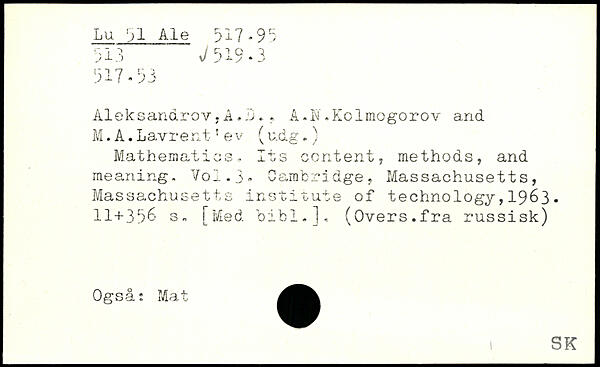 Aleksandrov,A.L., A.N,Kolmogorov and M.A.Lavrent'ev (udg.) Mathematics. Its content, methods, and meaning. Vo1.5