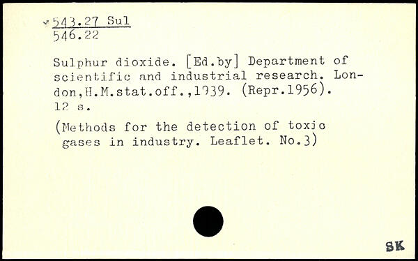 Sulphur dioxide. [Ed.by] Department of scientific and industrial research. London , H. M. s tat. of f. ,1739. (Repr.1956).