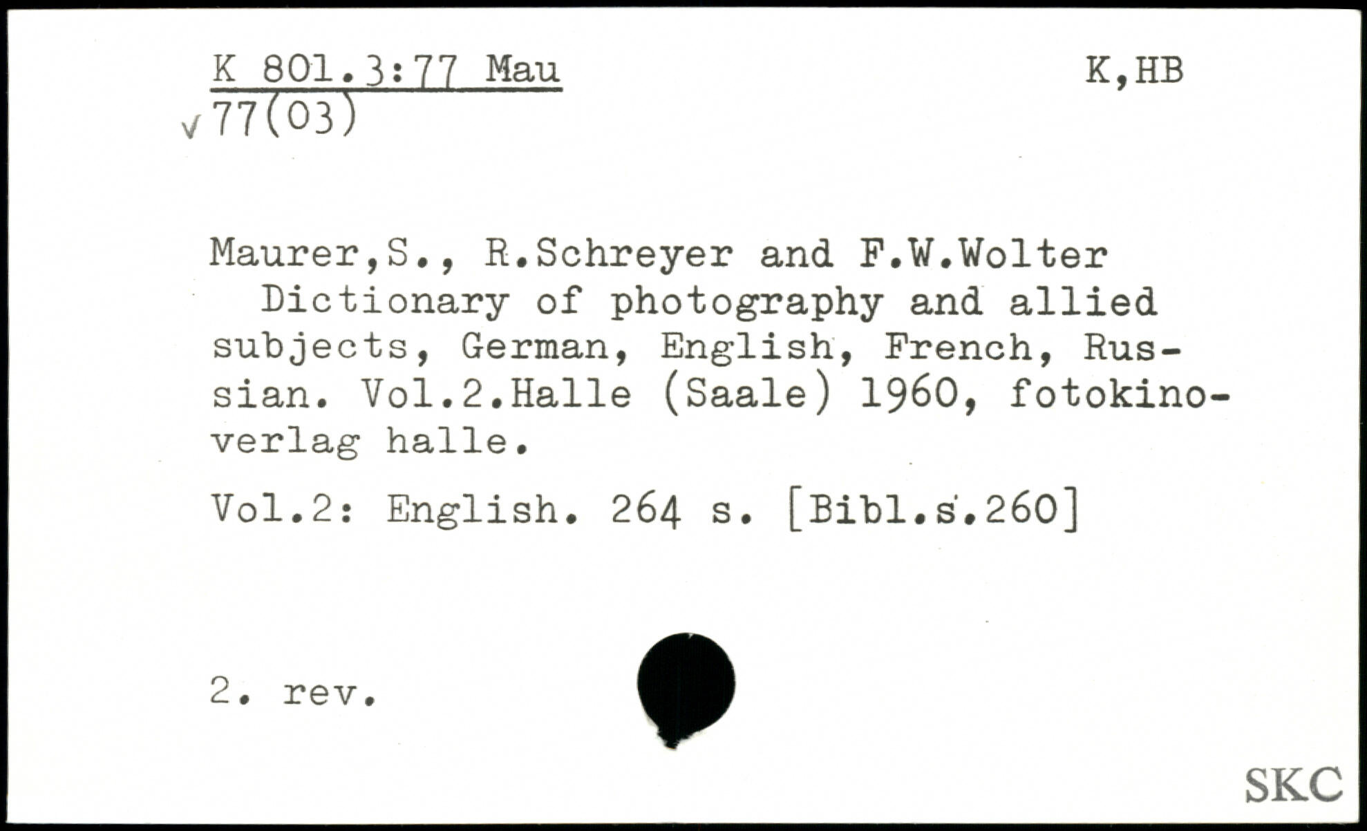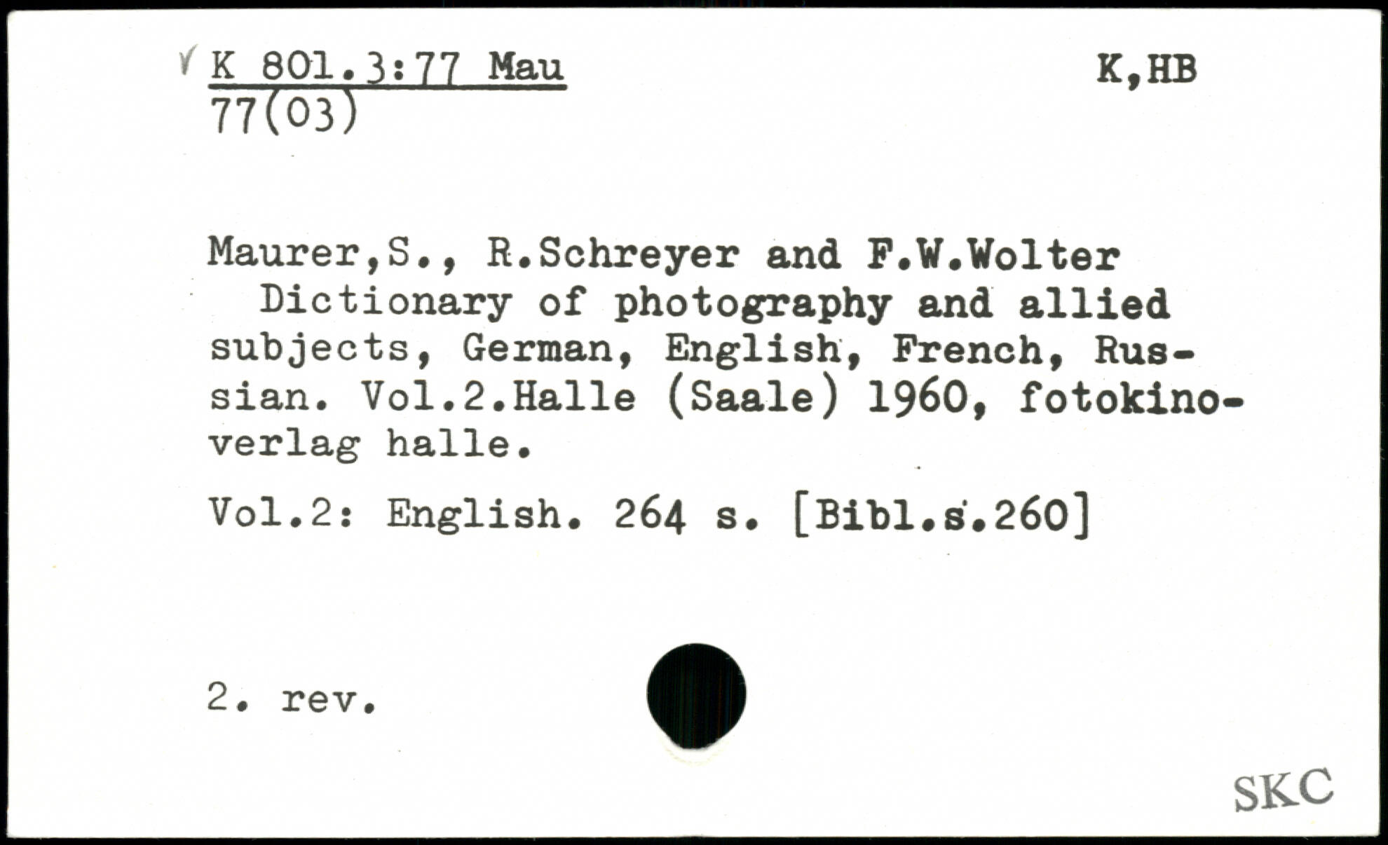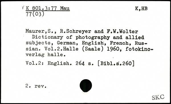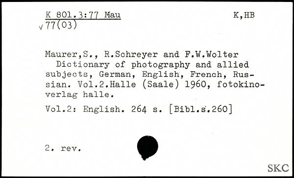 Maurer,S., R.Schreyer and F.W.Wolter Dictionary of photography and allied subjects, German, English, French, Russian.