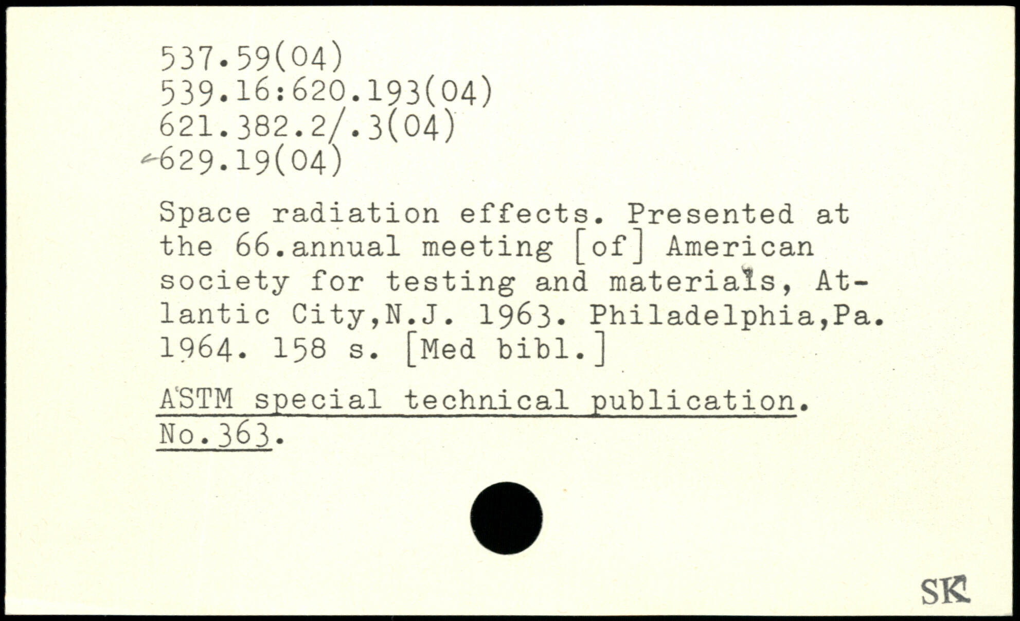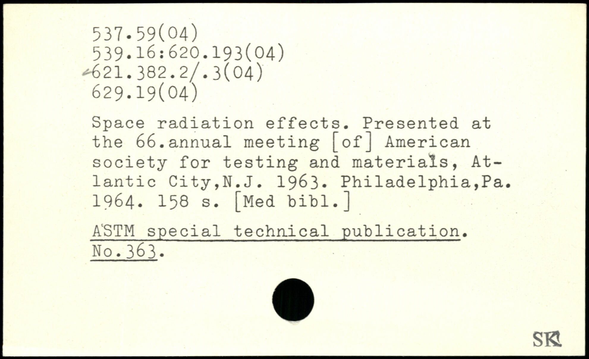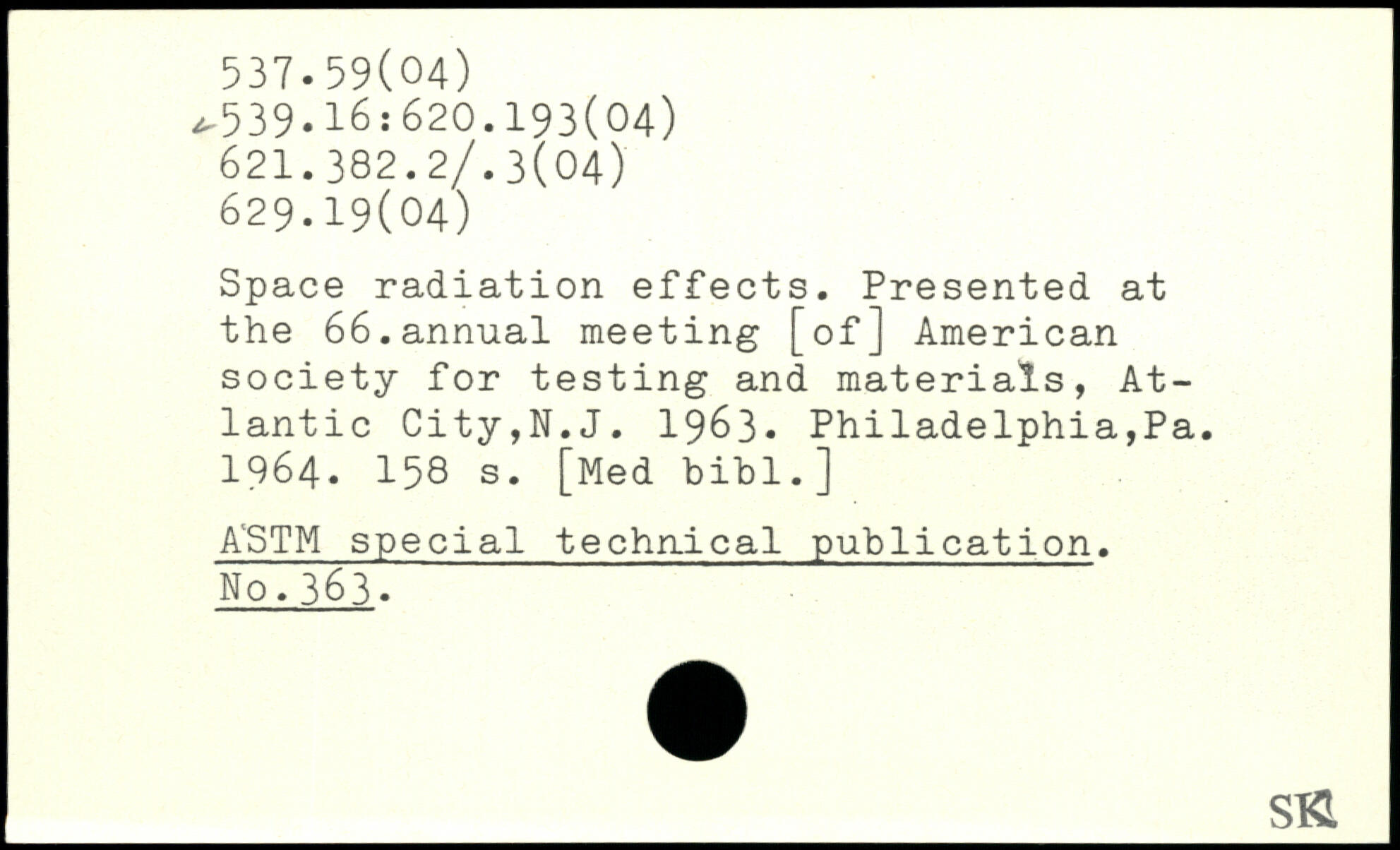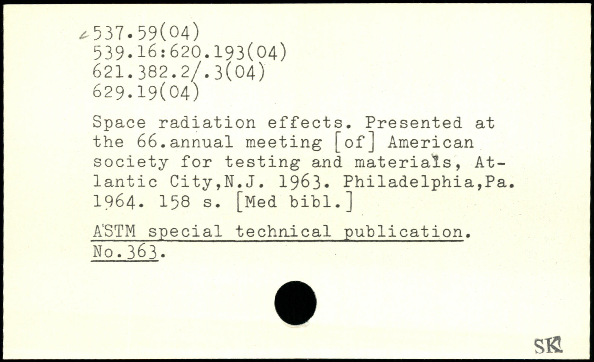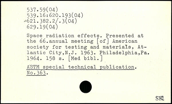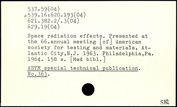 Space radiation effects. Presented at the 66.annual meeting [of] American society for testing and materials, Atlantic City,N.J. 1963- Philadelphia,Pa. 1964.