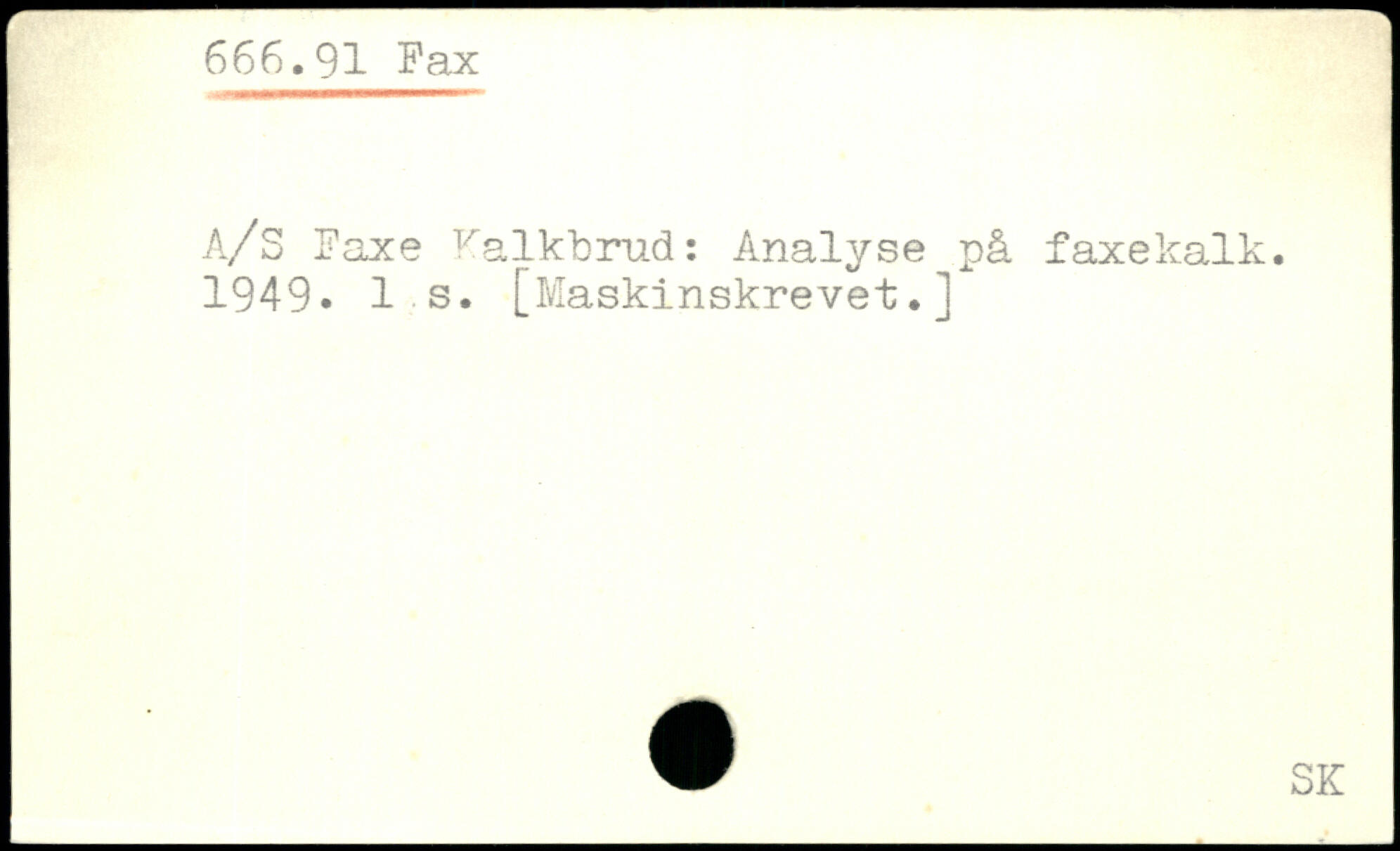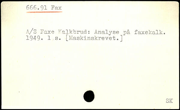 A/S ITaxe Kalkbrud: Analyse på faxekalk. I 1949. Is. [Maskinskrevet.]