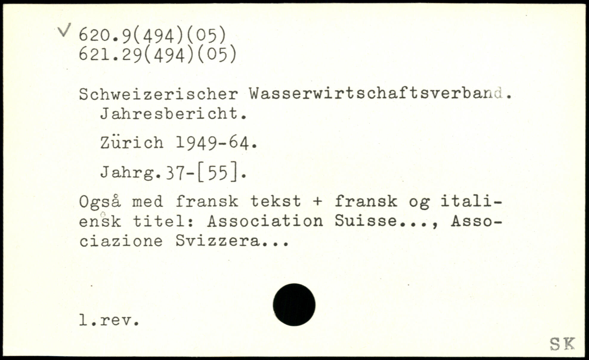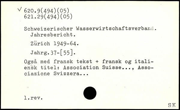 Schweizerischer Wasserwirtschaftsverband. Jahresbericht. Zürich 1949-64. Jahrg.37—[55]. Også med fransk tekst + fransk og italiensk titels Association Suisse..., Asso-ciazione Svizzera...