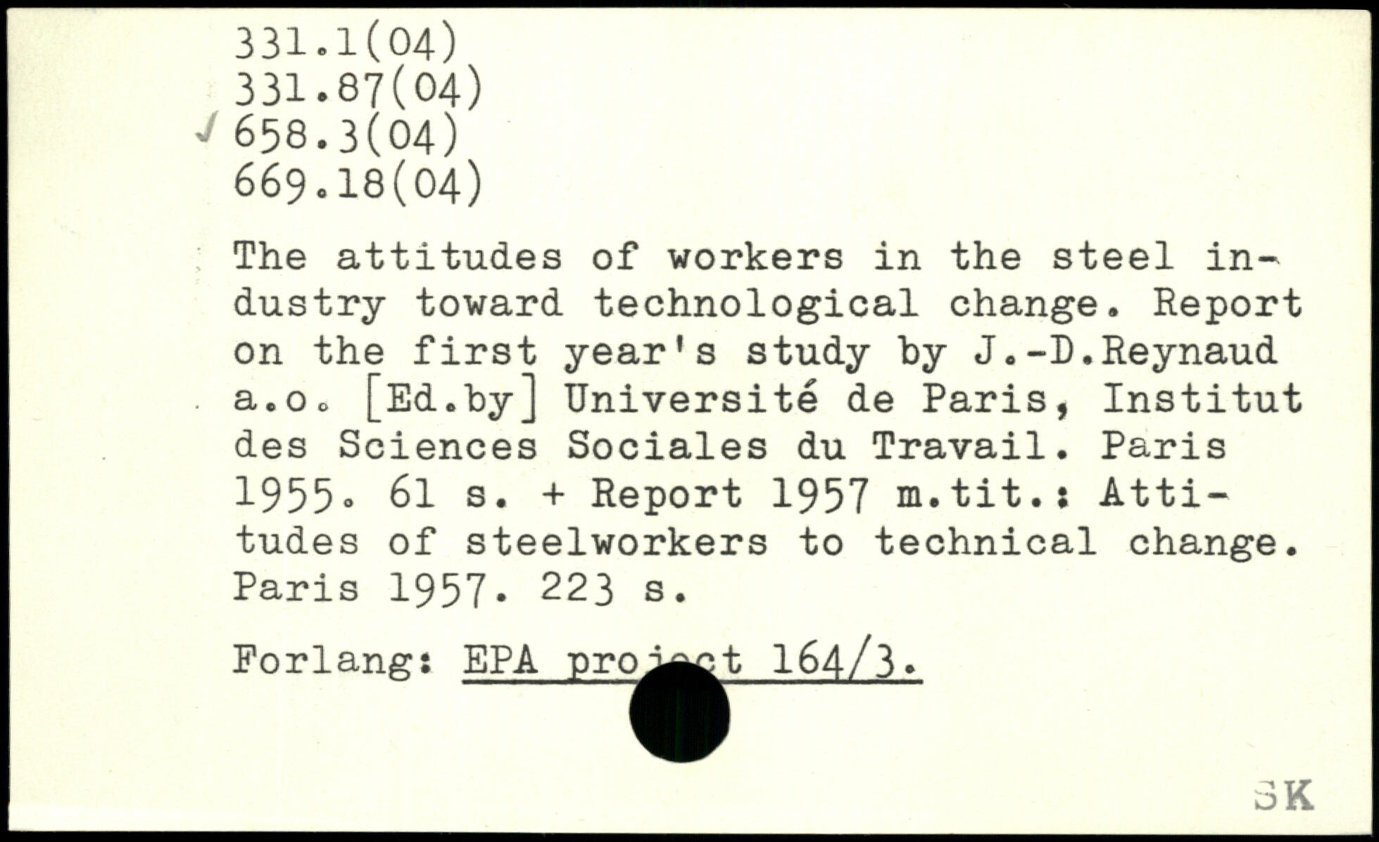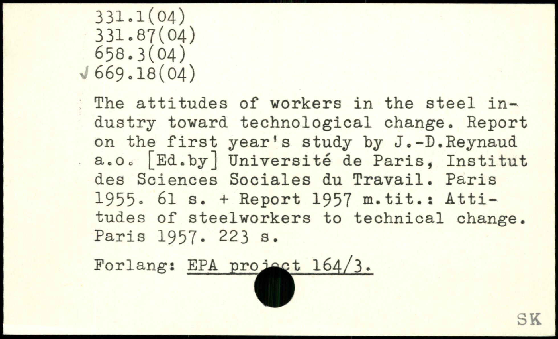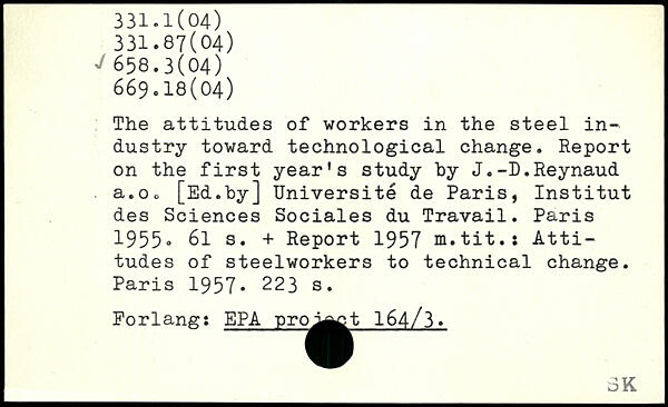 The attitudes of workers in the steel industry toward technological change. Report on the first year's study by J.-D.Reynaud a.Oo [Ed.by] Université de Paris, Institut des Sciences Sociales du Travail.