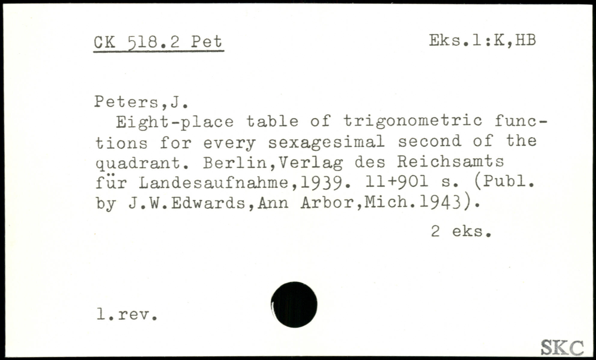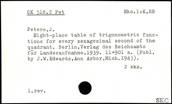 Eight-place table of trigonometric functions for every sexagesimal second of the quadrant. Berlin,Verlag des Reichsamts für Landesaufnahme,1939.