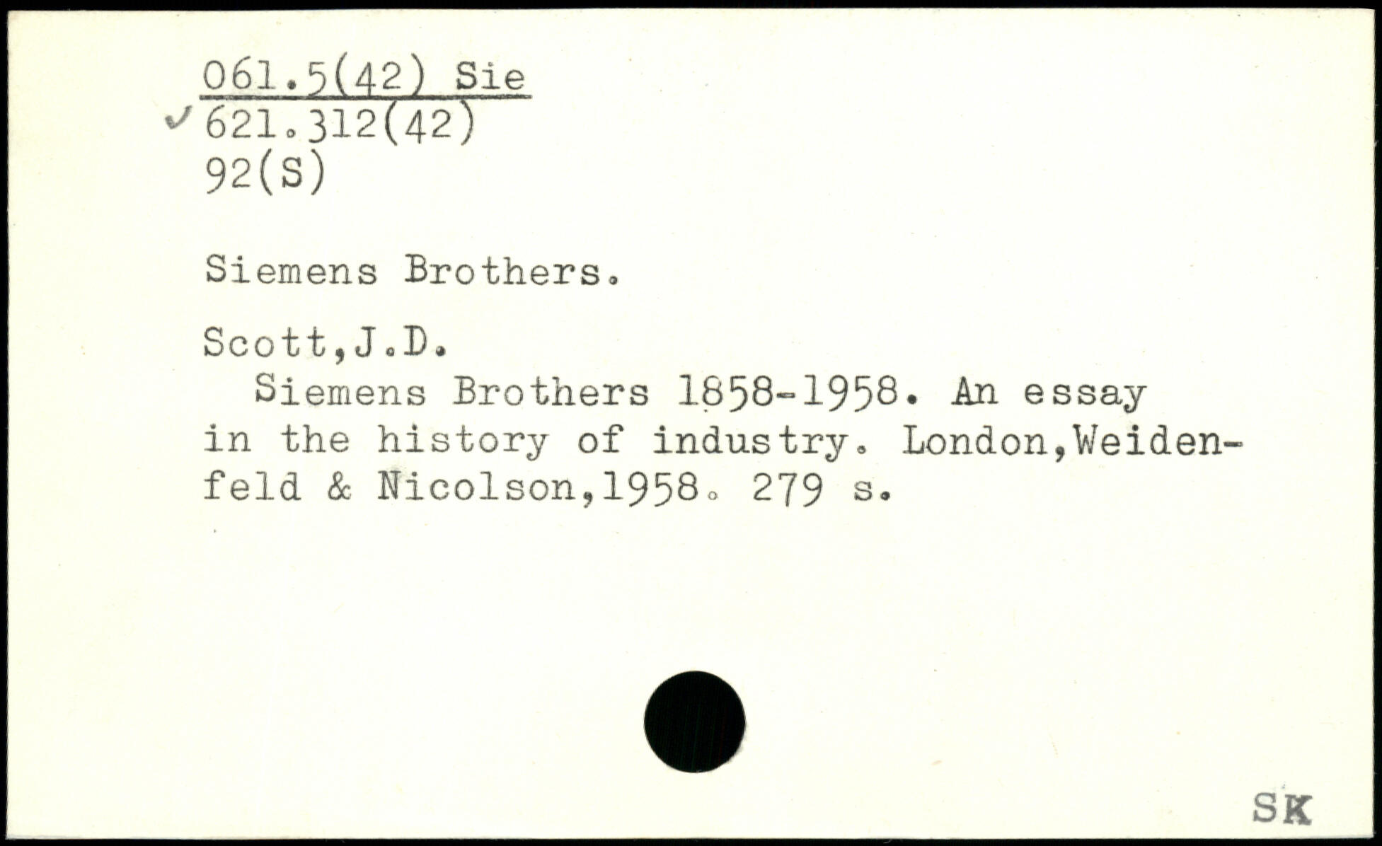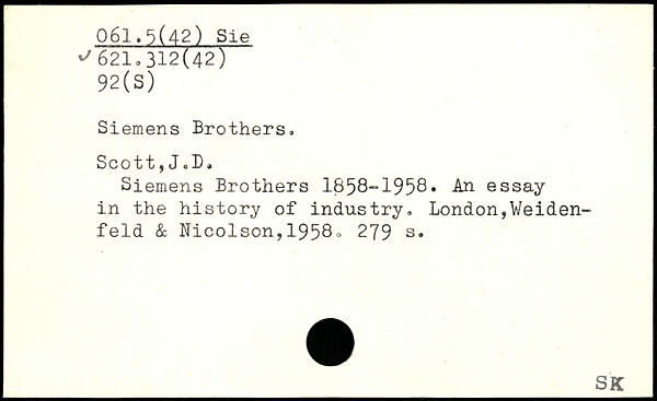 Siemens Brothers, Scott,J.D. Siemens Brothers 1858-1958, An essay in the history of industry