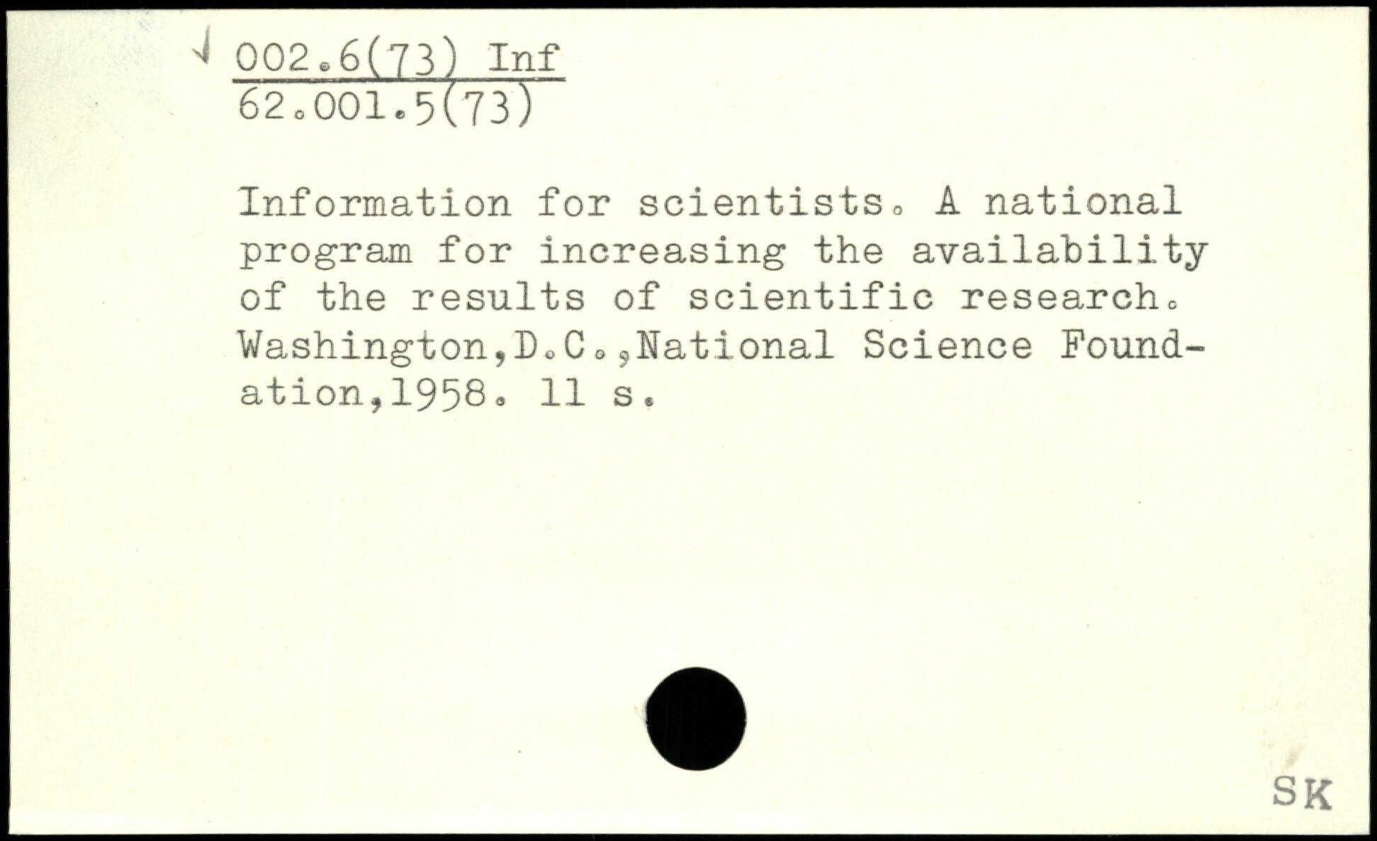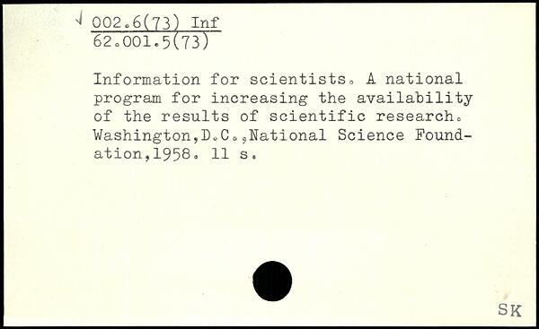 Information for scientists,, A national program for increasing the availability of the results of scientific research. Washington,DoCo^National Science Foundation, 1958