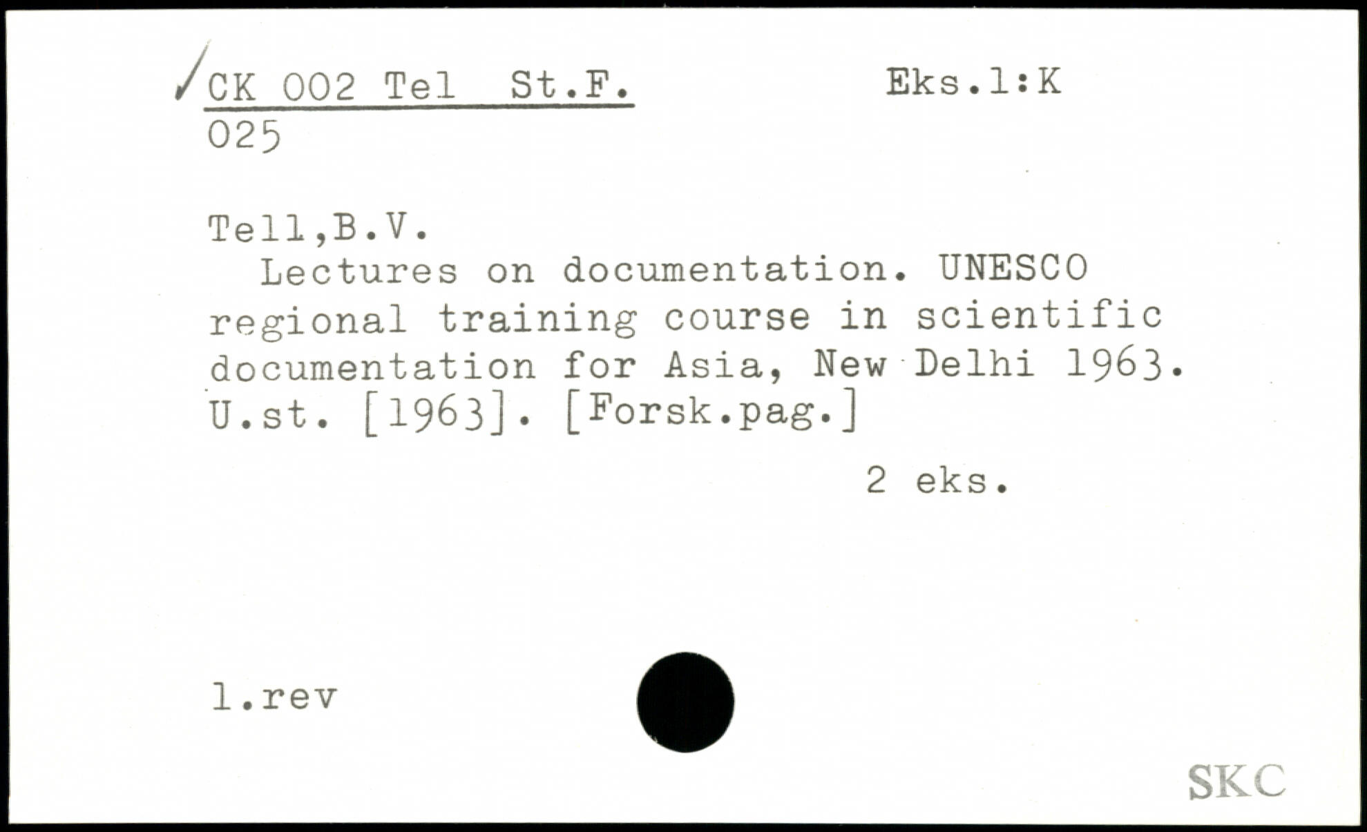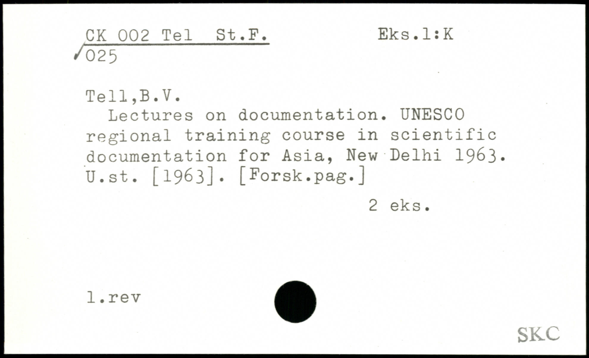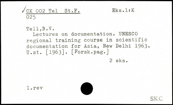 Lectures on documentation. UNESCO regional training course in scientific documentation for Asia, New Delhi 1963. U.st. [1963]. [Forsk.pag.]