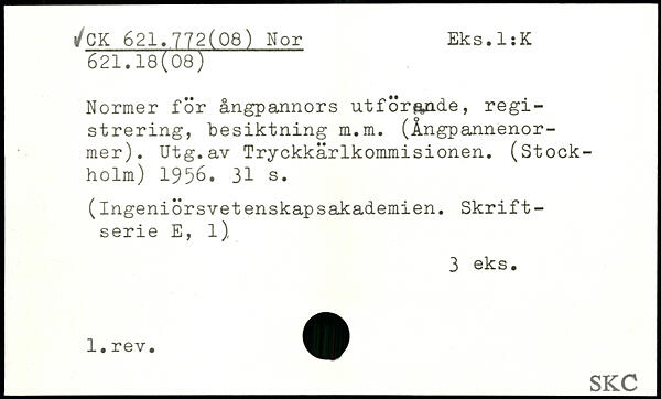 Normer för ångpannors utför&nde, registrering, besiktning m.m. (Ångpannenor-mer). Utg.av Tryckkärlkommisionen. (Stockholm) 1956.