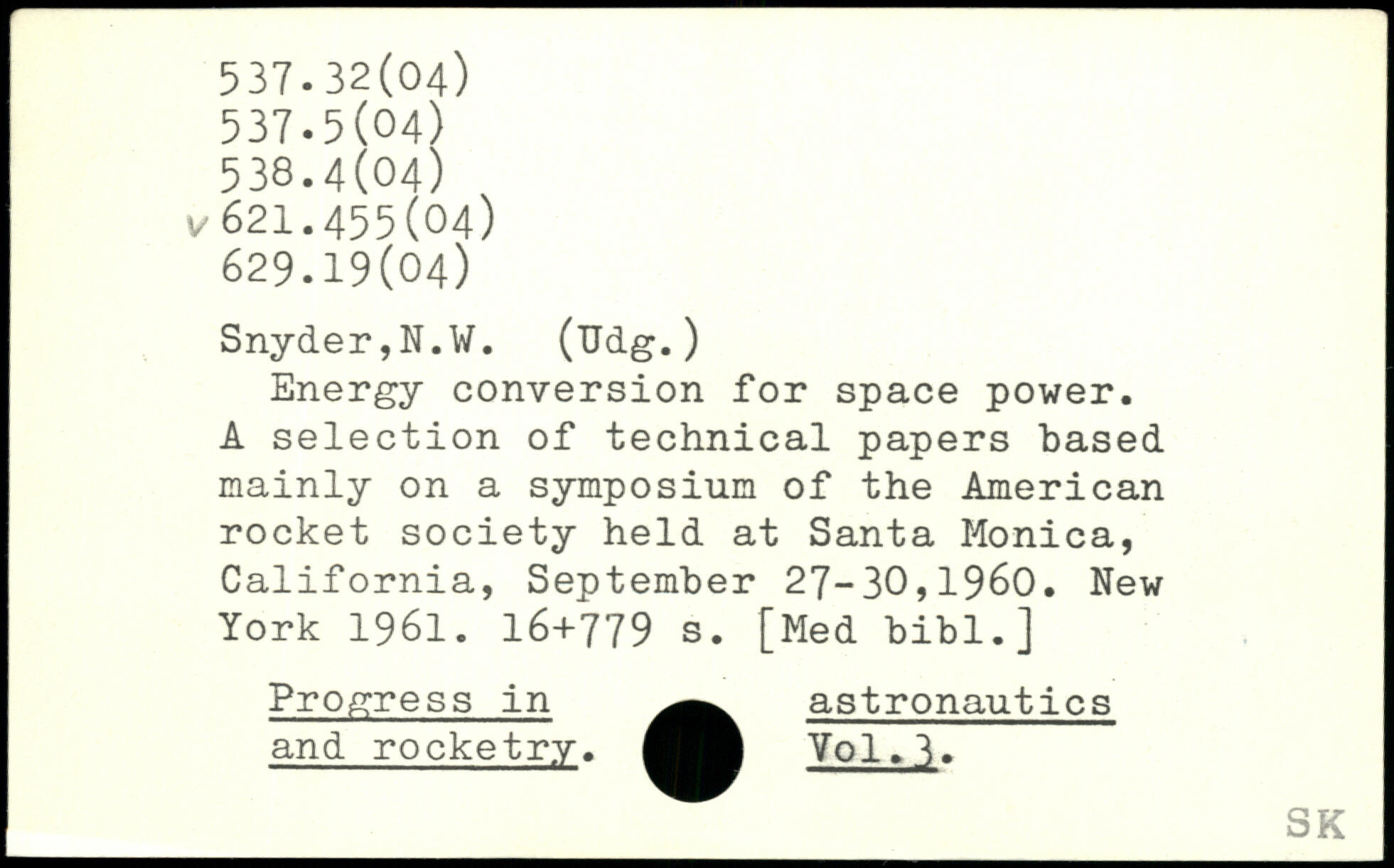 Energy conversion for space power. A selection of technical papers based mainly on a symposium of the American rocket society held at Santa Monica, California, September 27-30,1960.
