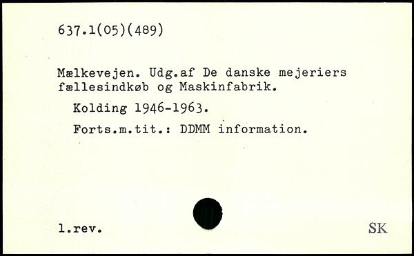 Mælkevejen. Udg.af De danske mejeriers fællesindkøb og Maskinfabrik. Kolding 1946-1963. Forts.m.tit.: DDMM information.