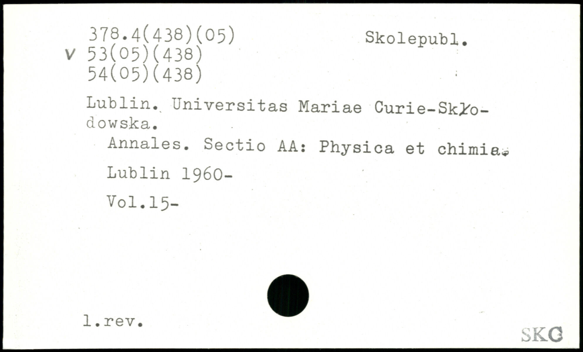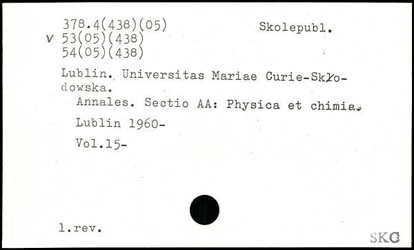 Lublin. Universitas Mariae Curie-Sklb-dowska. Annales. Sectio AA: Physica et chimia. Lublin 1960- l.rev. _ _.-0