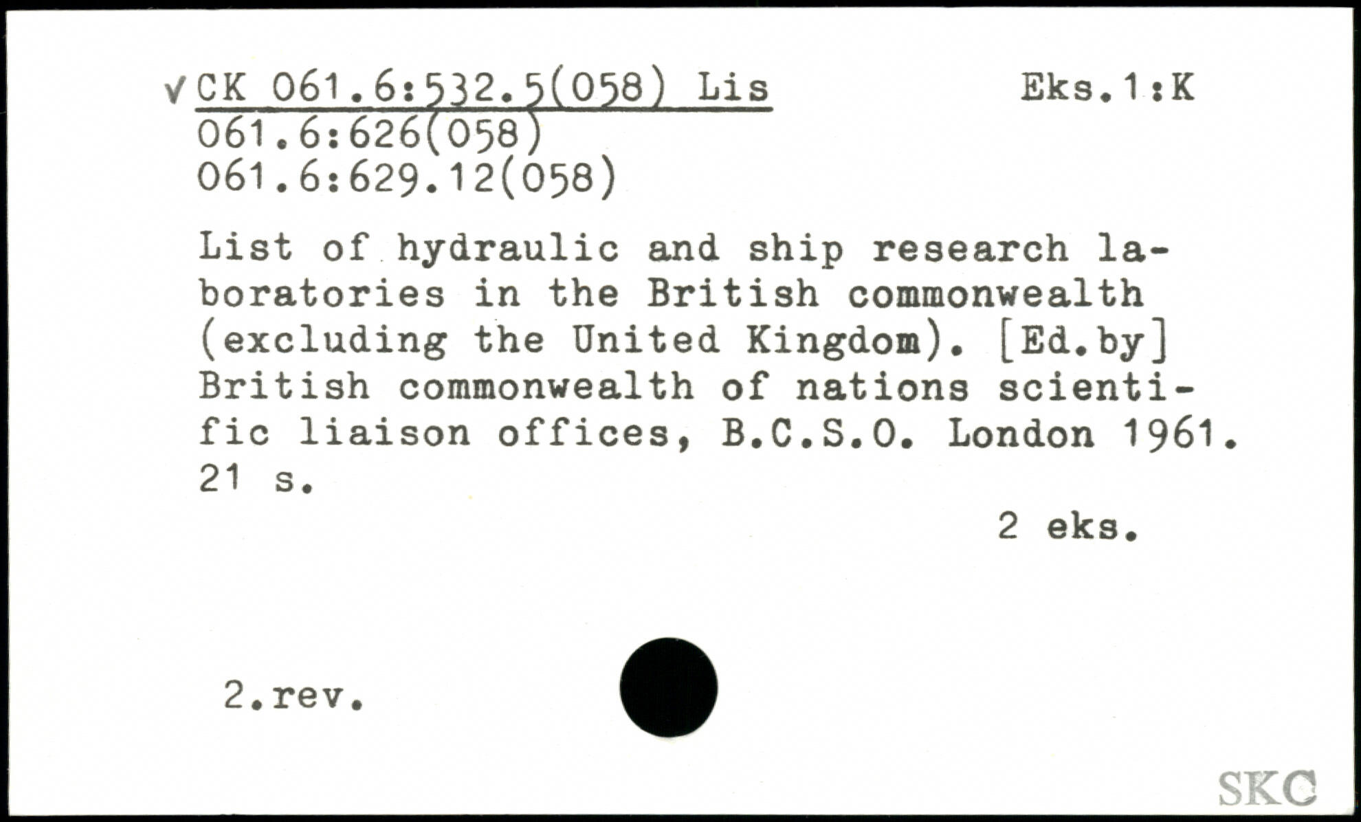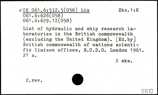 List of hydraulic and ship research laboratories in the British commonwealth (excluding the United Kingdom). [Ed.by] British commonwealth of nations scientific liaison offices, B.C.S.O.