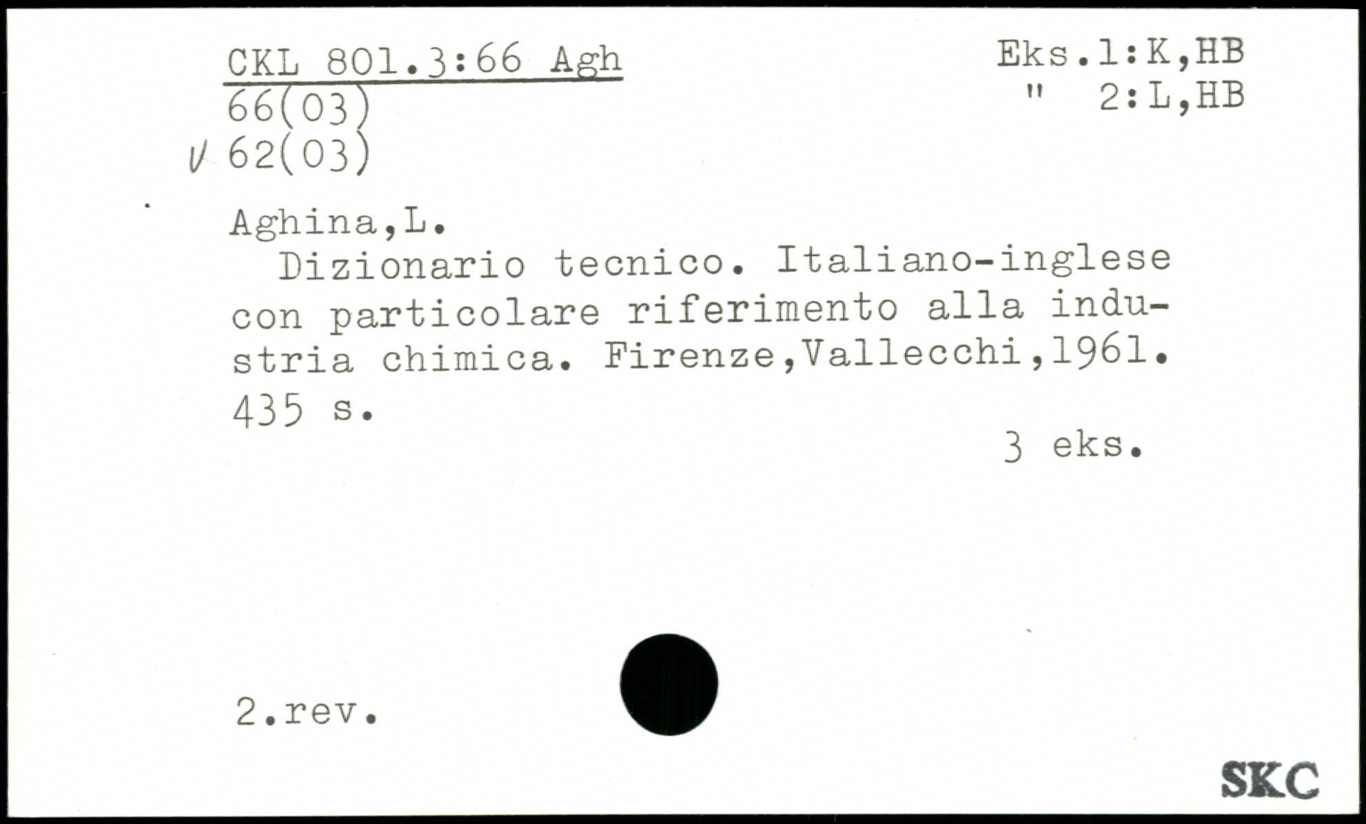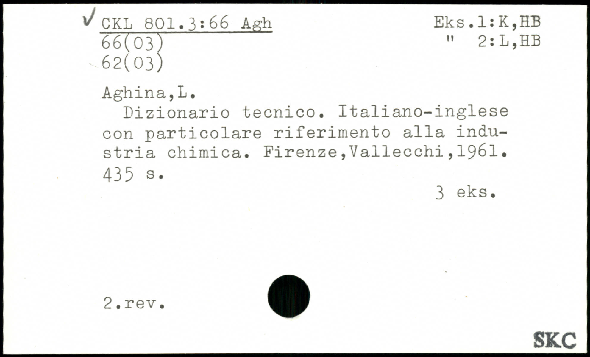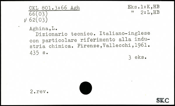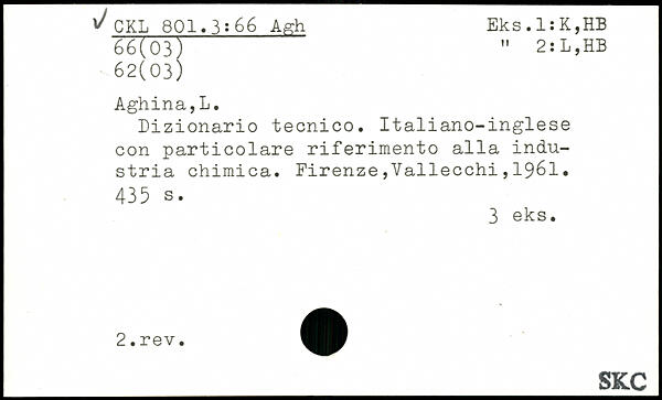 Dizionario tecnico. Italiano-inglese con particolare riferimento alla industria chimica.