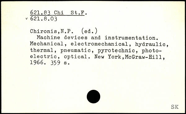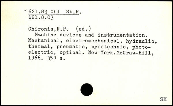 Machine devices and instrumentation. Mechanical, electromechanical, hydraulic, thermal, pneumatic, pyrotechnic, photoelectric, optical.