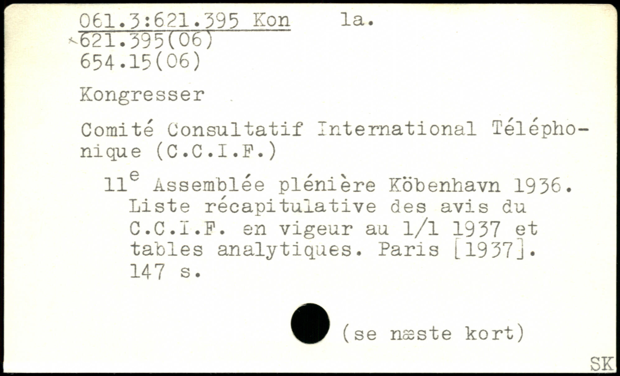 Comité Consultatif International Téléphonique ( C. C. I. P. ) 11e Assemblée plénière Kobenhavn 1936. Liste récapitulative des avis du C.C.Ï.P. en vigeur au l/l 1937 et tables analytiques. Paris [Ï937].