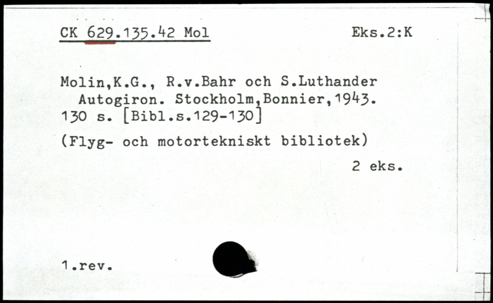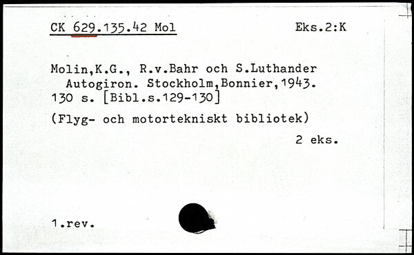 Molin,K.G., R.v.Bahr och S.Luthander Autogiron. Stockholm,Bonnier,19^3
