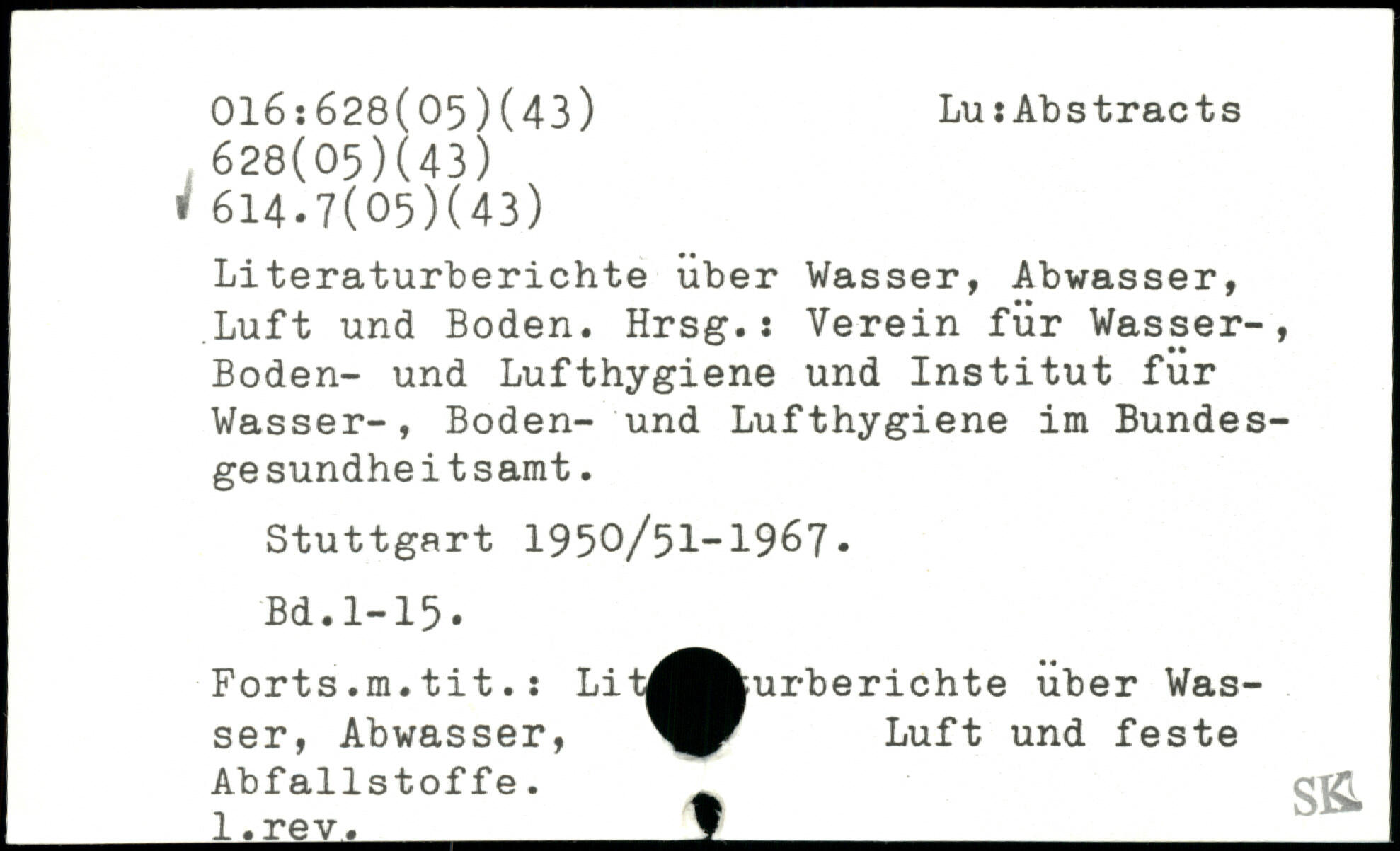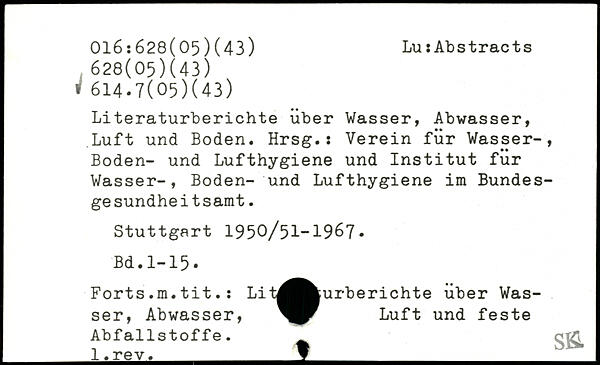 Literaturberichte über Wasser, Abwasser, Luft und Boden. Hrsg.: Verein für Wasser-, Boden- und Lufthygiene und Institut für Wasser-, Boden- und Lufthygiene im Bundesgesundheitsamt.